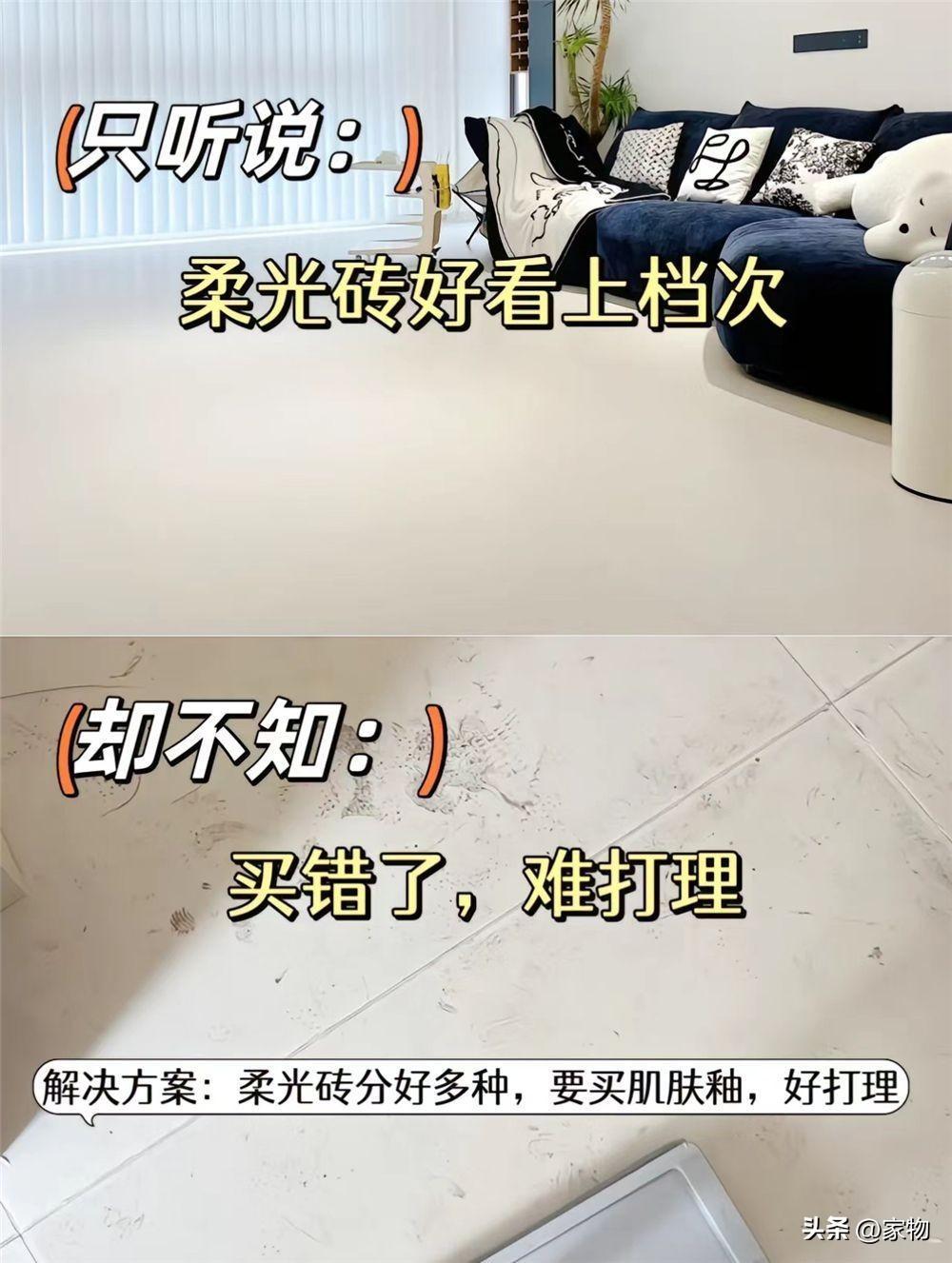 就我個人而言,柔光磚也確實比亮面瓷磚好看,但要知道,千萬別買錯,有很多表面磨砂質感的柔光磚,真的特別難打理,最好是帶有肌膚釉的柔光磚,相對好擦一些。