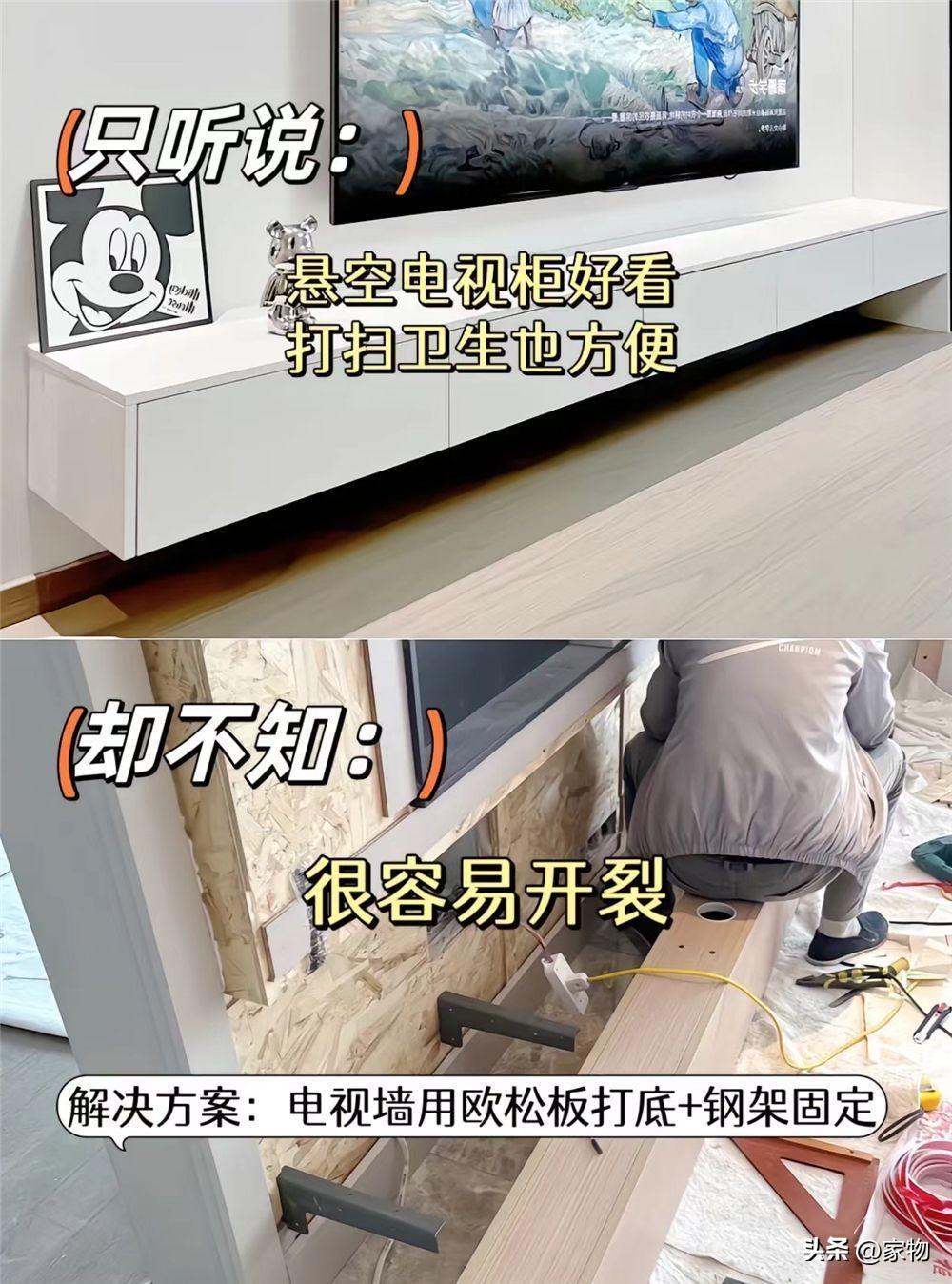 如果想裝懸空電視櫃,除了看牆體承重以外,還要去看安裝工藝,用歐松板打底+鋼架固定,才能保證穩固,很多人家裏的懸空電視櫃開裂掉落,往往也是工藝不過關的原因,能做落地還是做落地的吧。
