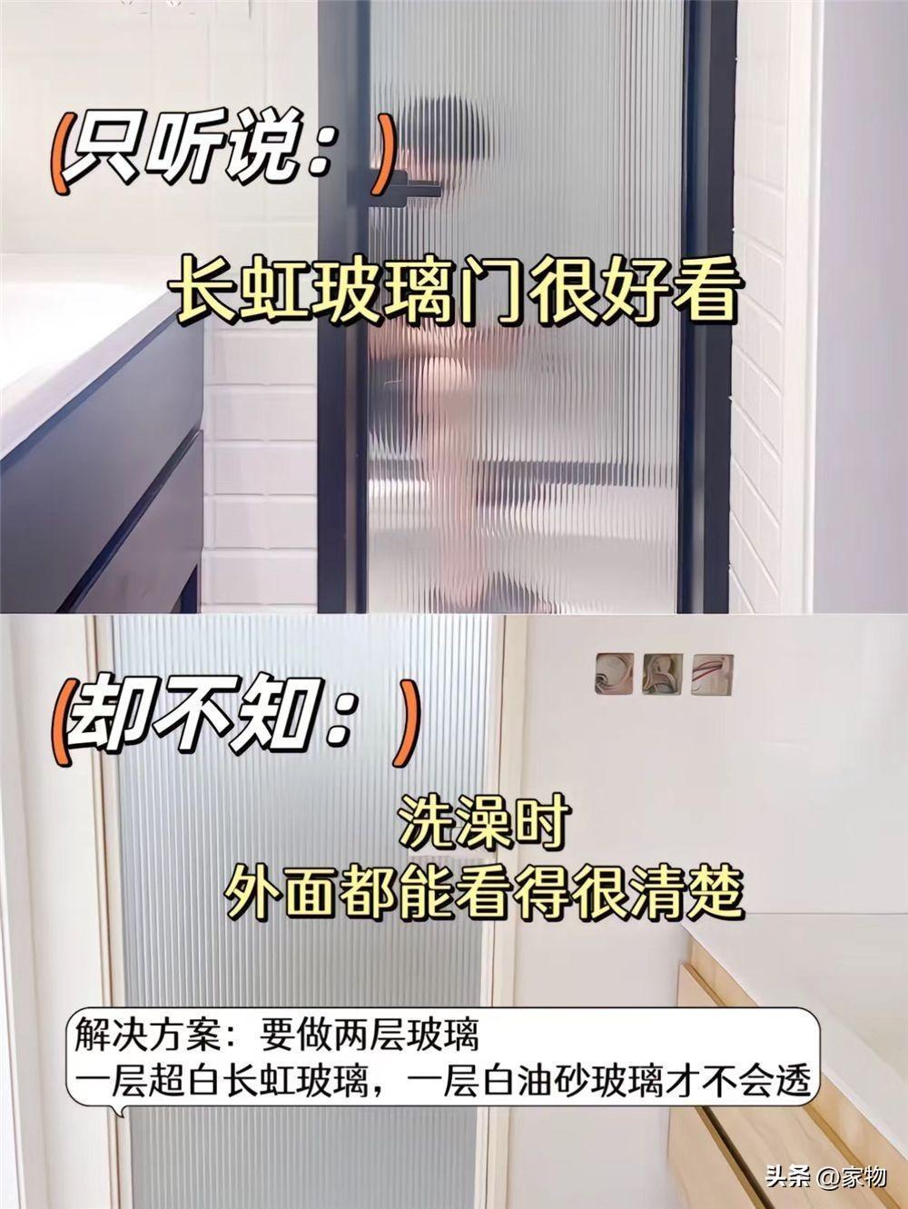 最後,廚房和衛生間裏的長虹玻璃門,雖然好看,但記住千萬別做單層,尤其是衛生間,會將人整個透出來,不是透明玻璃也差不多了,最好是做兩層超白玻璃的,不發綠還能透光不透人。