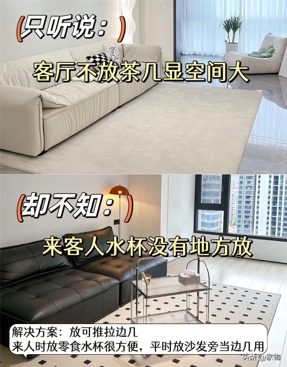 我承認,客廳不放茶几確實適合一部分的人,但真不建議所有人都學,最起碼,如果完全沒有茶几的話,杯子、遙控器、手機等物都沒地方放,真的挺憋屈的;再不濟,也最好放個邊幾。