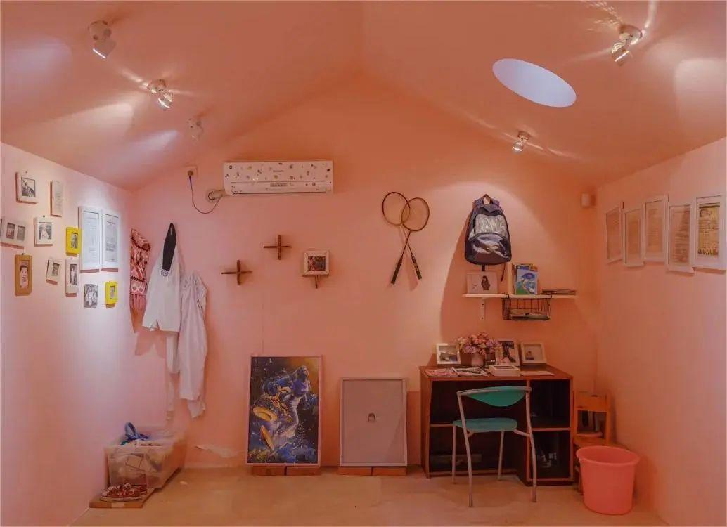 牆上懸掛着所有物品,展現了一位普通中學女生的生活痕跡,照片、書包、筆記本、羽毛球拍、跆拳道服...房子沒有窗戶,僅有一個圓形天窗灑下一束白光,純潔而細膩,集聚安寧與和諧。