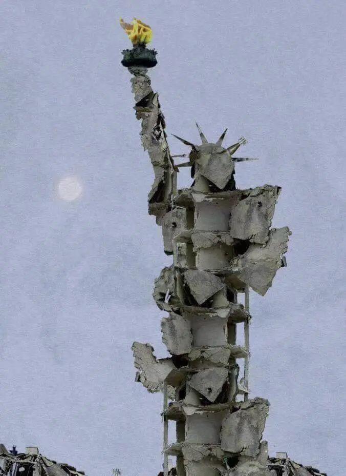 敘利亞藝術家Tammam Azzam,用被轟炸過的建築殘骸,電腦合成了自由女神像的副本,這幅圖片被命名爲:這就是他們帶給我們的自由,極具諷刺。