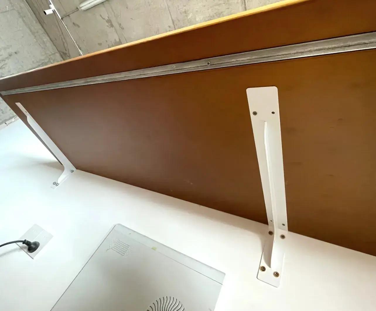 像撐這個桌子的腳架,普通的大三角架肯定會外露,爲了適配懸浮效果,只有換成這種極簡腳架。