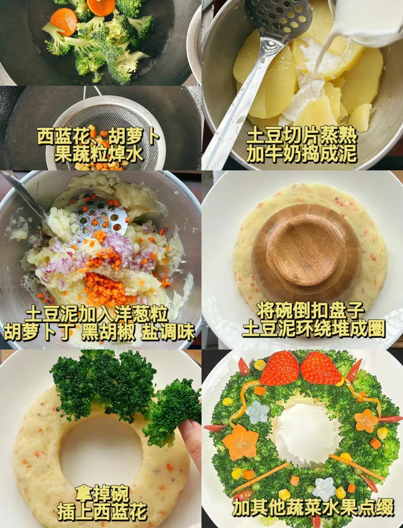 將西蘭花、胡蘿蔔果蔬粒焯水後備用,然後將土豆蒸熟後加牛奶搗成泥,爲了口味更豐富,還可以加入洋蔥粒、胡蘿蔔、黑胡椒、鹽等調味。