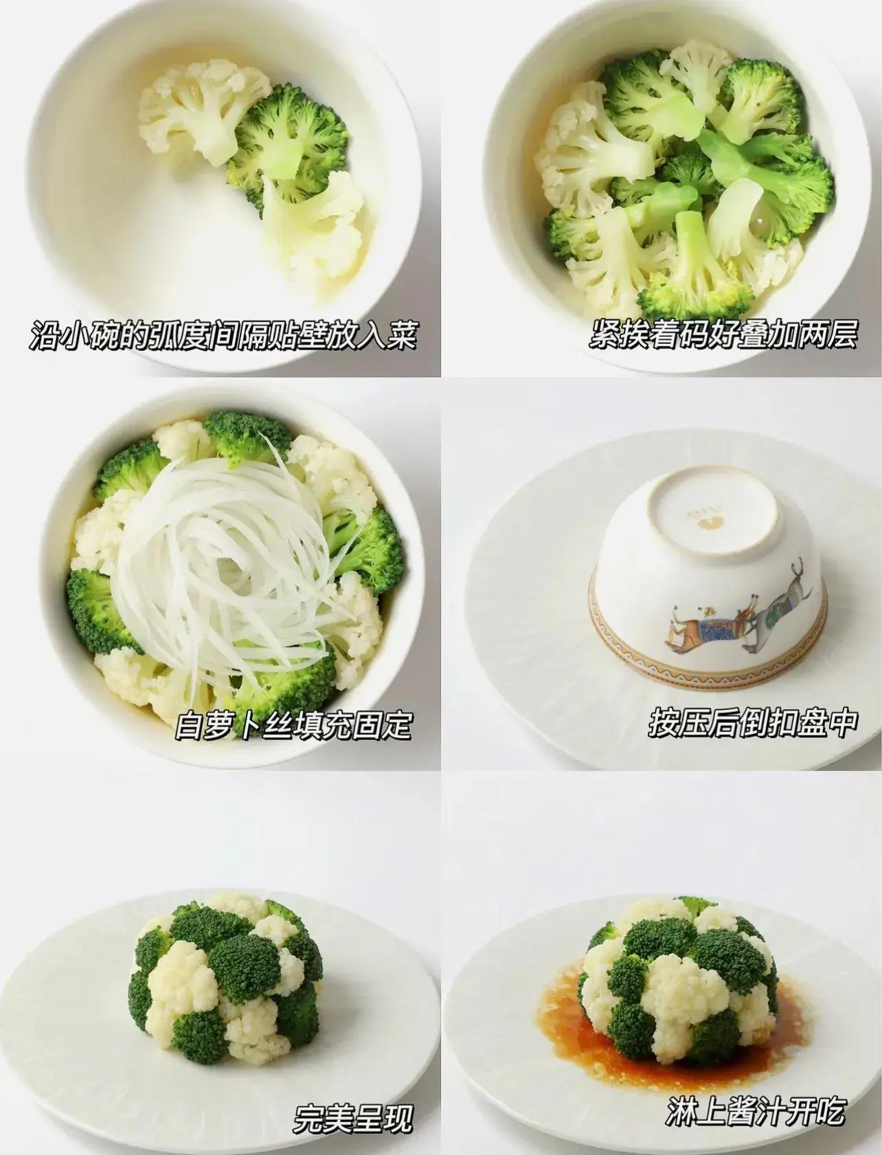 把菜花和西蘭花交錯,沿小碗的弧度間隔放入,一層層疊加後,中間用菜蘿蔔絲填充固定,然後按壓緊實後倒扣盤中,一個完美的足球菜花就誕生啦。