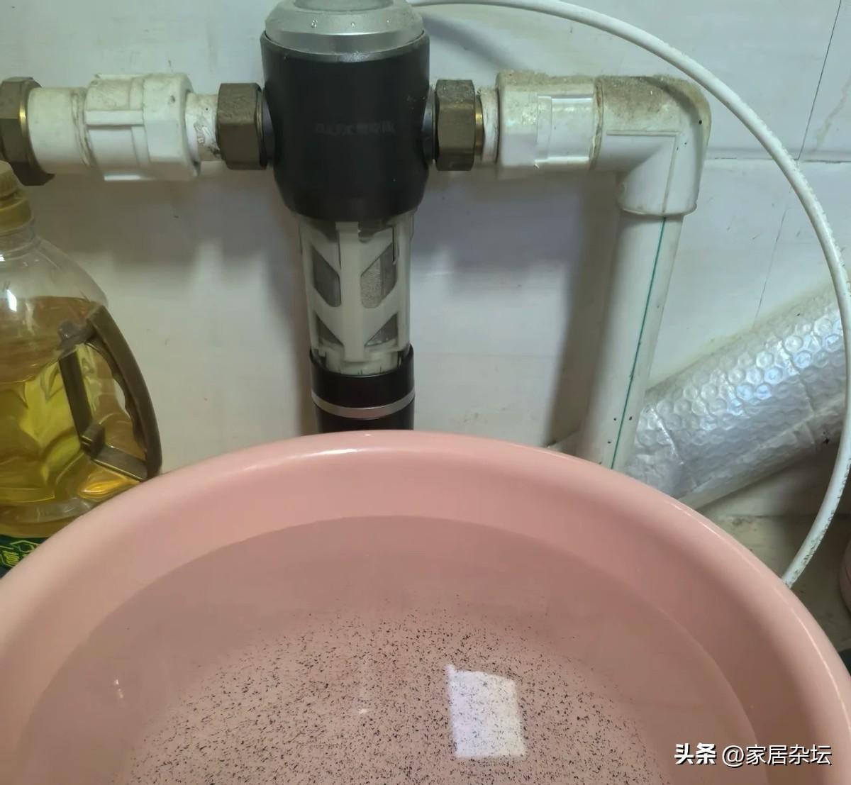 ②、沖洗。其實現在的前置過濾器,大多可以反衝洗。我們找一個接水的盆,然後擰動上面的手柄,進行反衝洗,直到衝出來的是清水就可以了。