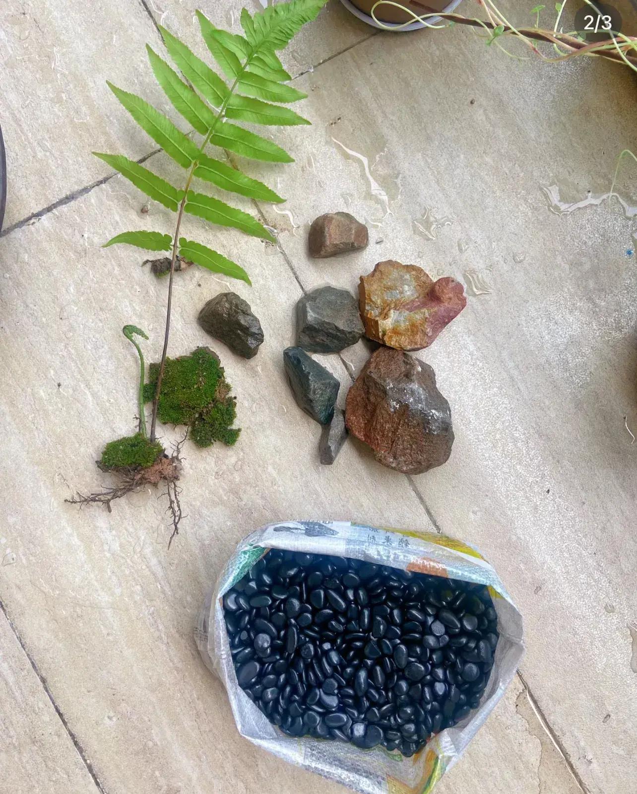同上面講的苔蘚,底部的土壤爲:輕石、水苔、赤玉土三層一層層鋪上。然後再把外出挖來的貫衆和苔蘚種進去,最後再用鵝卵石作爲裝飾即可。