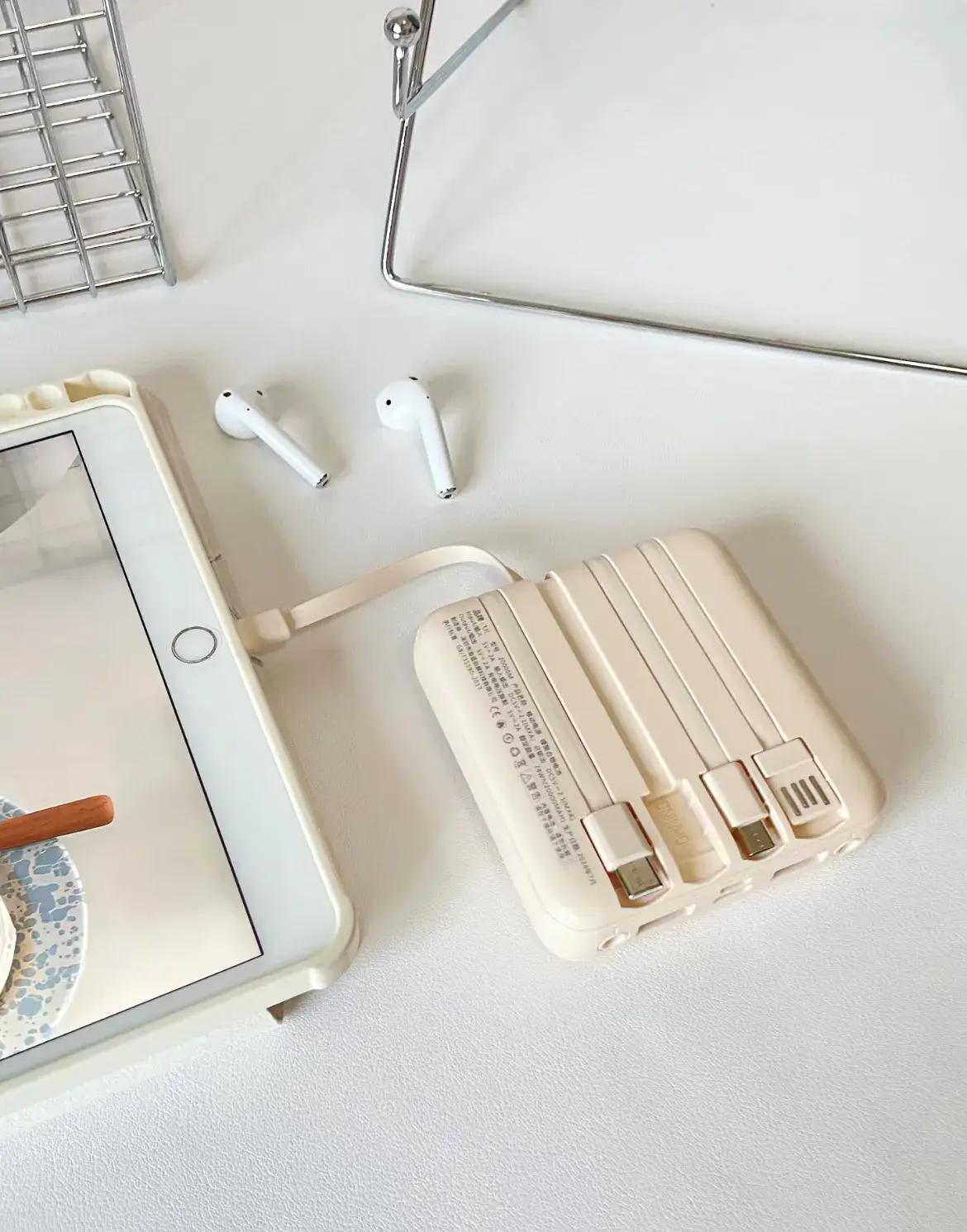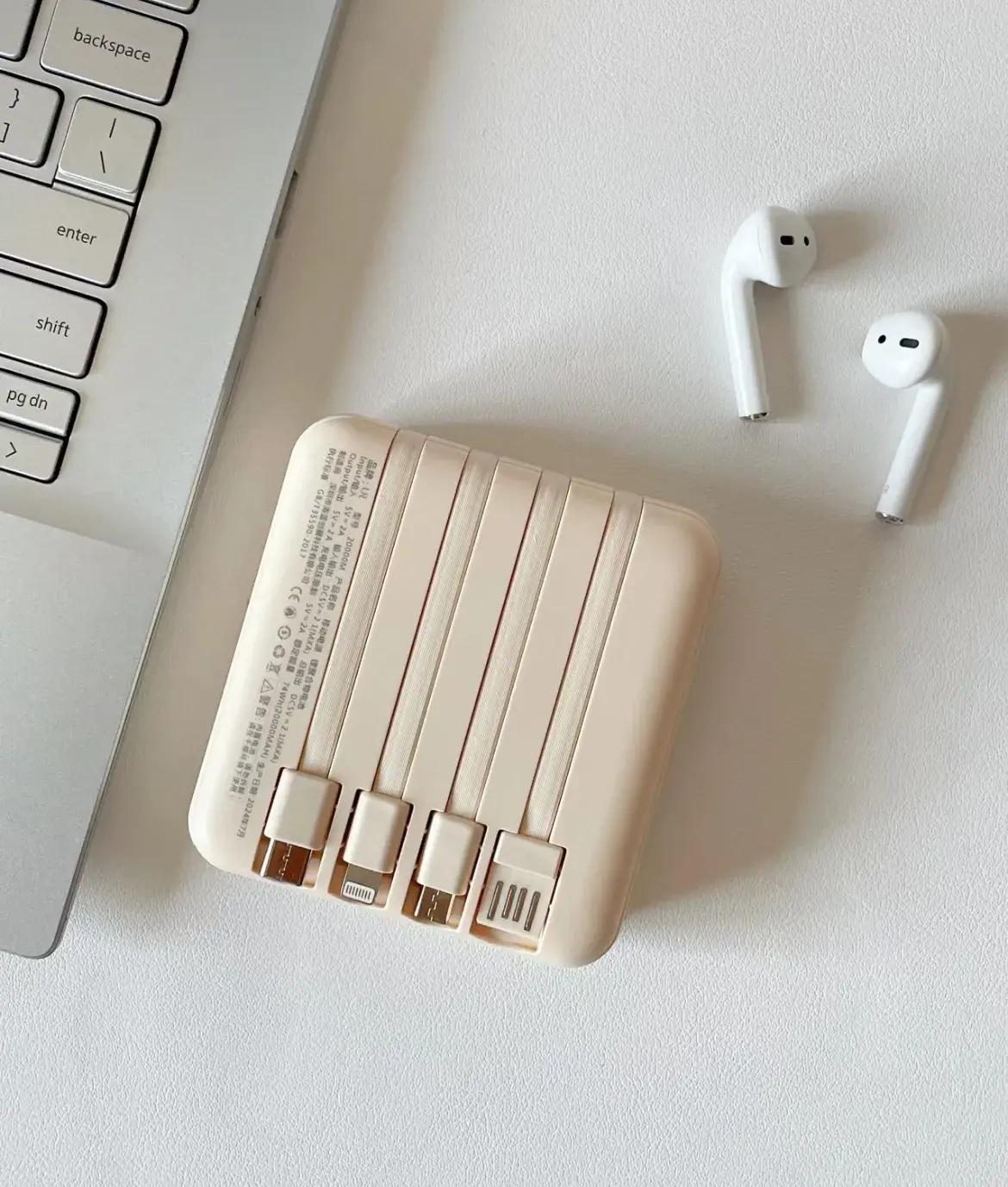 不瞞你們說,我以前也這樣,但自從買了這個四線充電寶之後沒有過了,原因是它不僅小巧,還帶四個不同插孔的線。