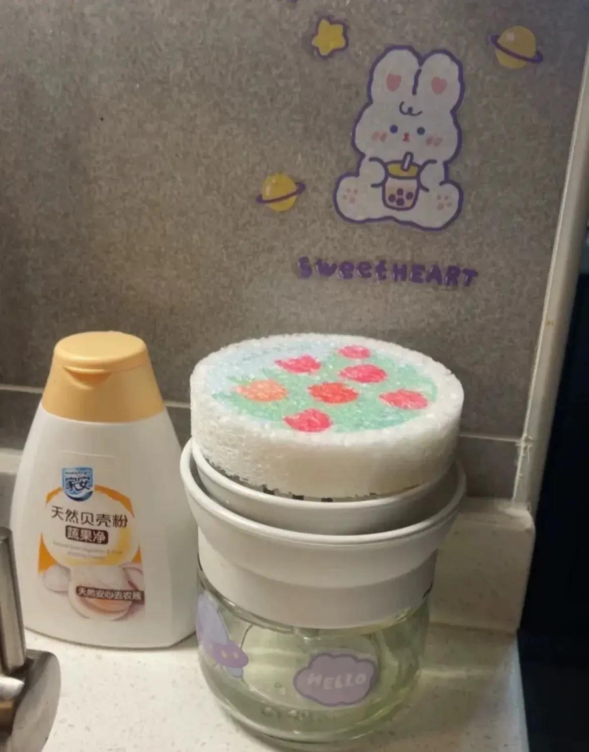 它下面是透明的部分是用來裝洗潔精的,上面自帶了一個收納槽,可以收納洗碗棉。