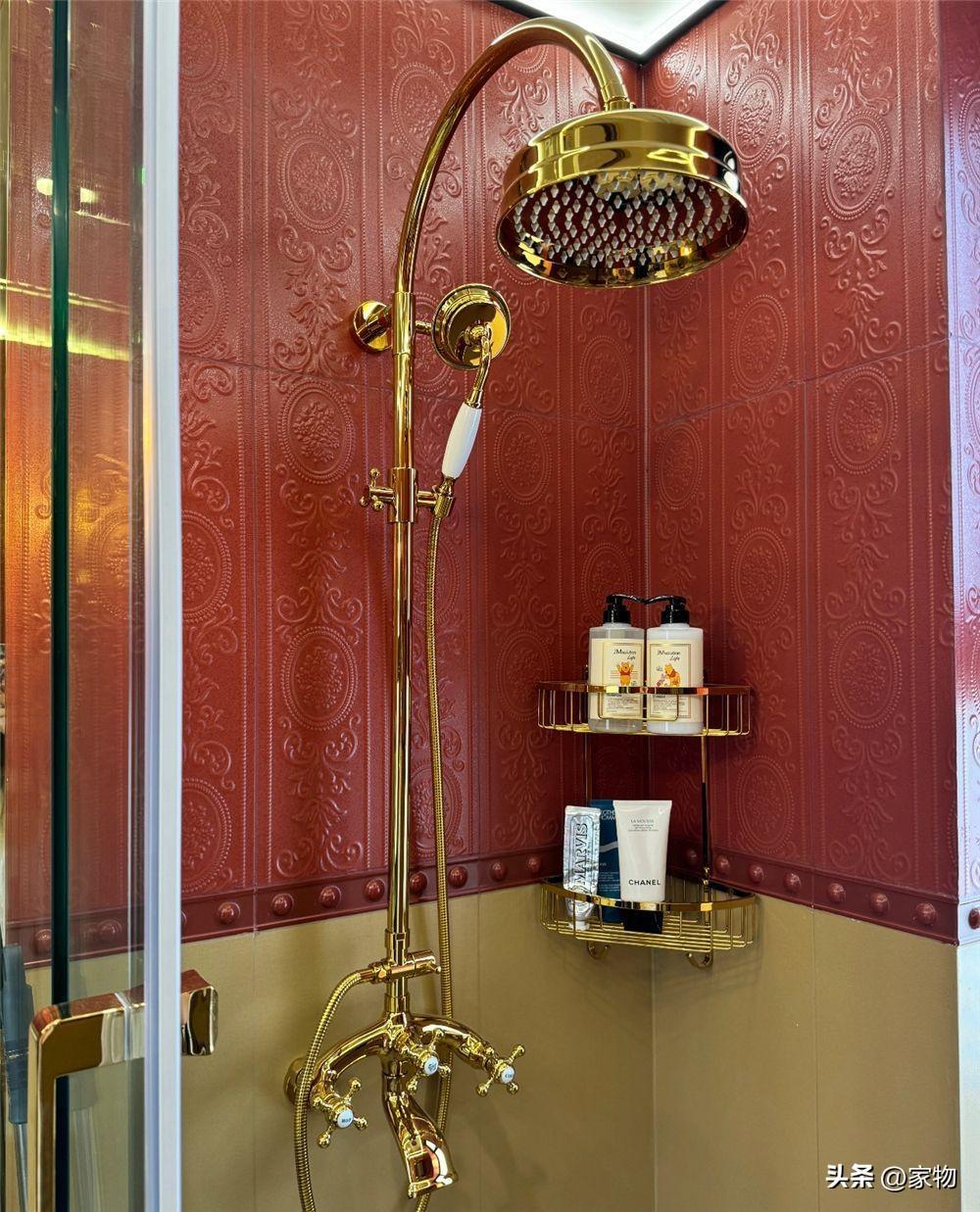 左顧右盼,問題還是出現了浴室的區域,這裏的花磚和地面大面積暴露,就迎合了我一開始說到的雜亂感問題,銅色的花灑倒是還好,但白色的浴室潔具,和空間完全不搭,最大的敗筆是地磚,破壞了整個空間的色調和諧。