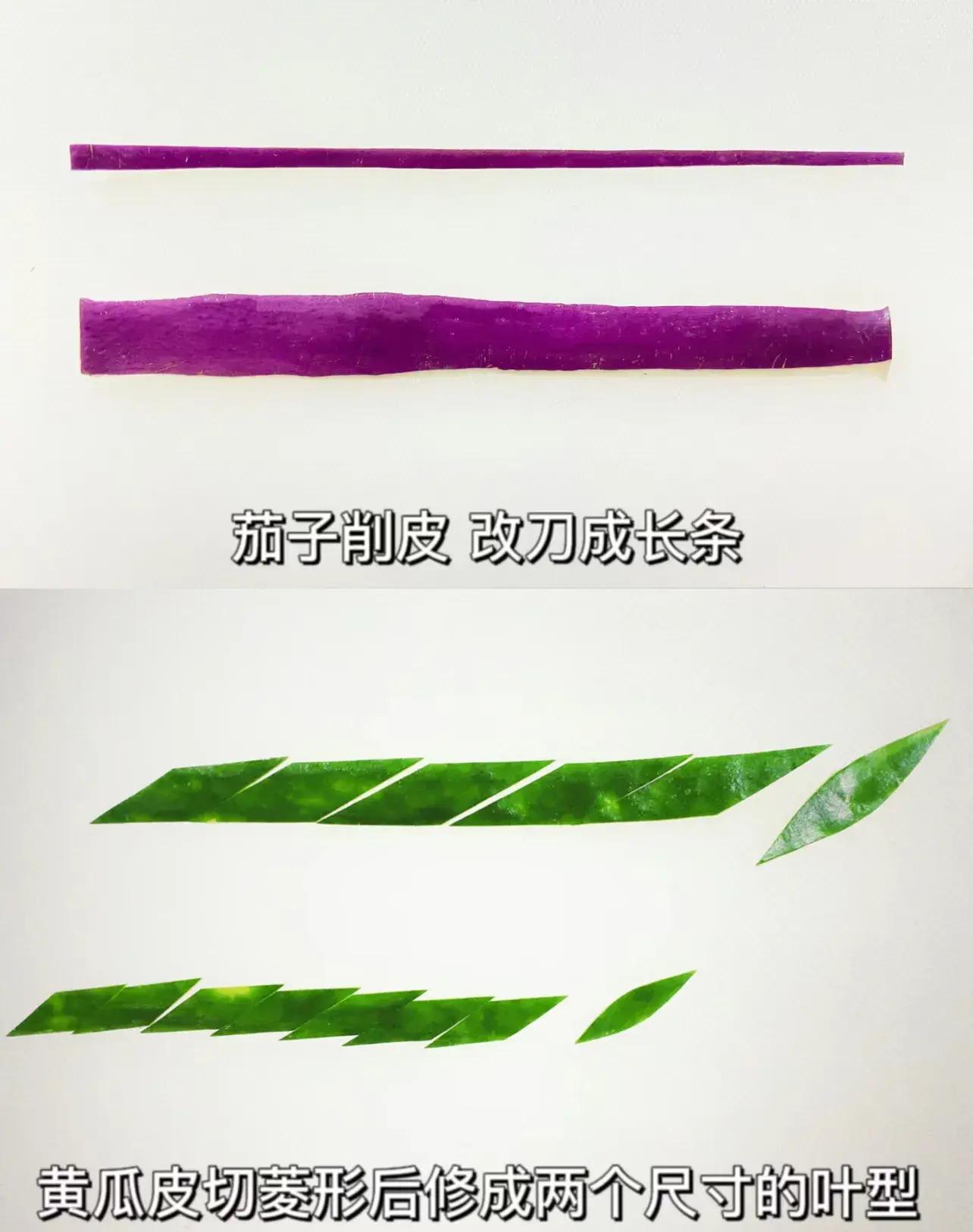 藤蔓、也是枝條依舊用茄子皮,改刀成長條,更細節點的,可以下粗上細做老莖嫩枝過渡。