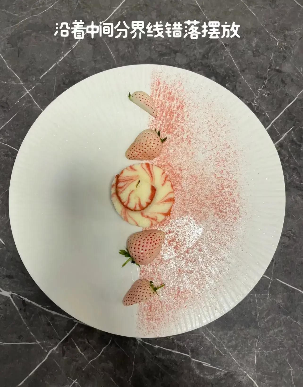 先將草莓粉灑在半邊盤子上,爲了邊界整齊,可以用紙或者其它有縱線的東西遮擋一下。