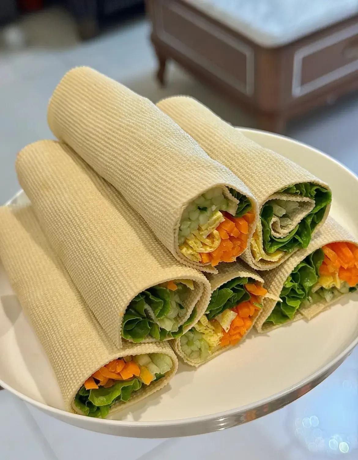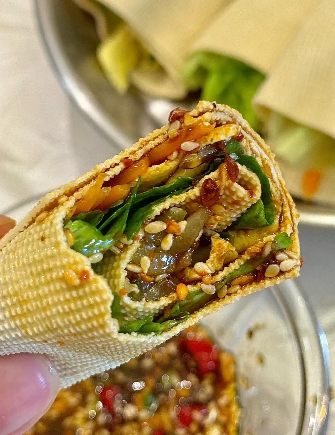 將豆皮燙熟後,可以卷生的黃瓜、胡蘿蔔絲,也可以清炒一下再卷,整個捲起來喫的感覺,就跟煎餅一樣,超級好喫,又比煎餅做着便捷,熱量還低。