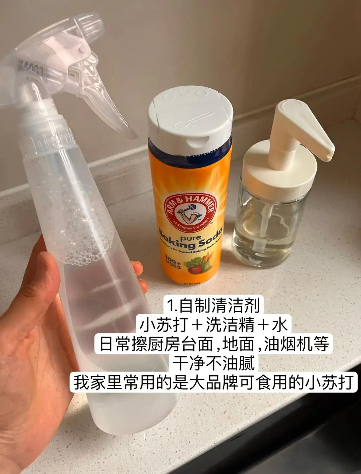 比如,小蘇打+洗潔精+水,日常擦廚房檯面、地面乾淨不油膩;
