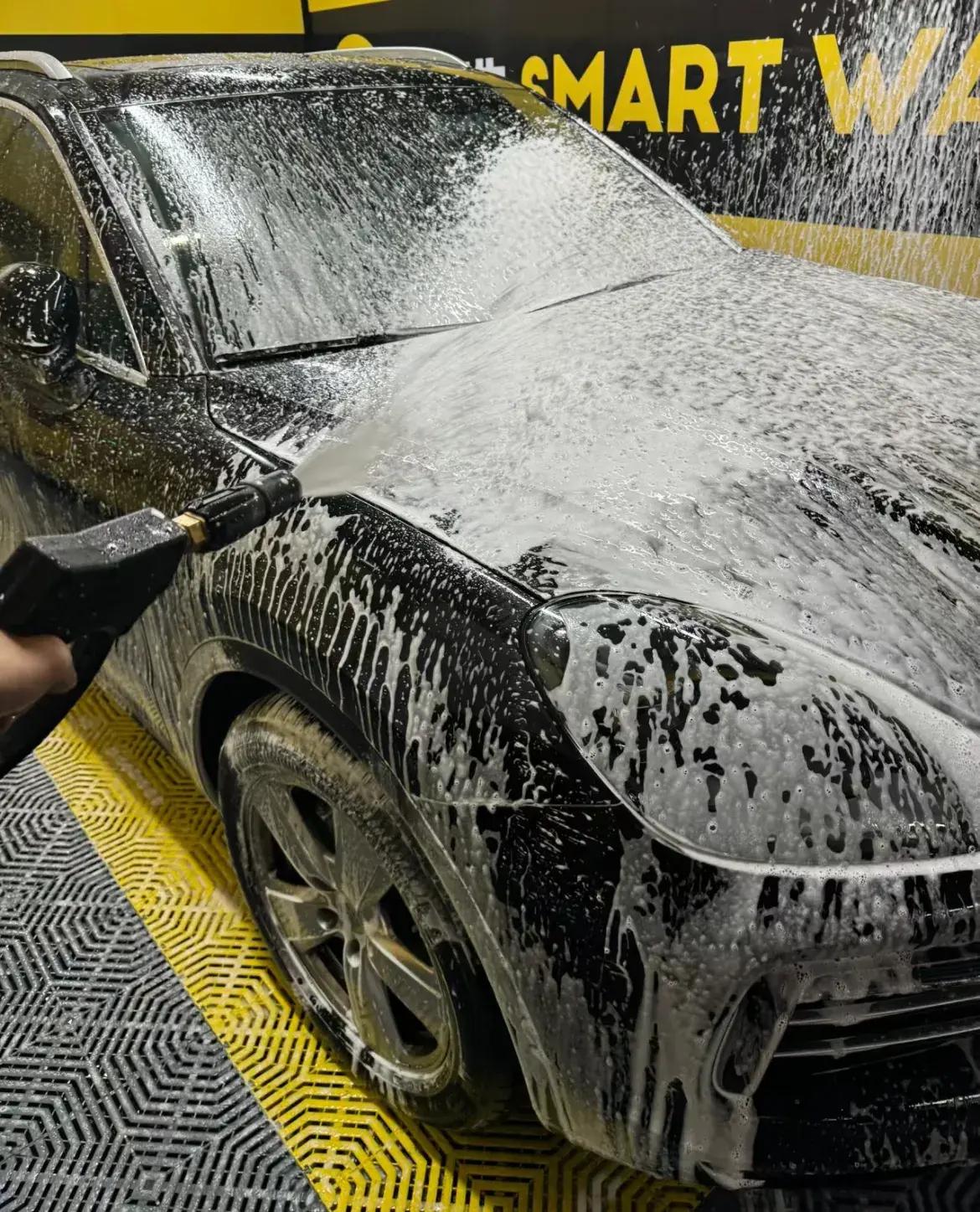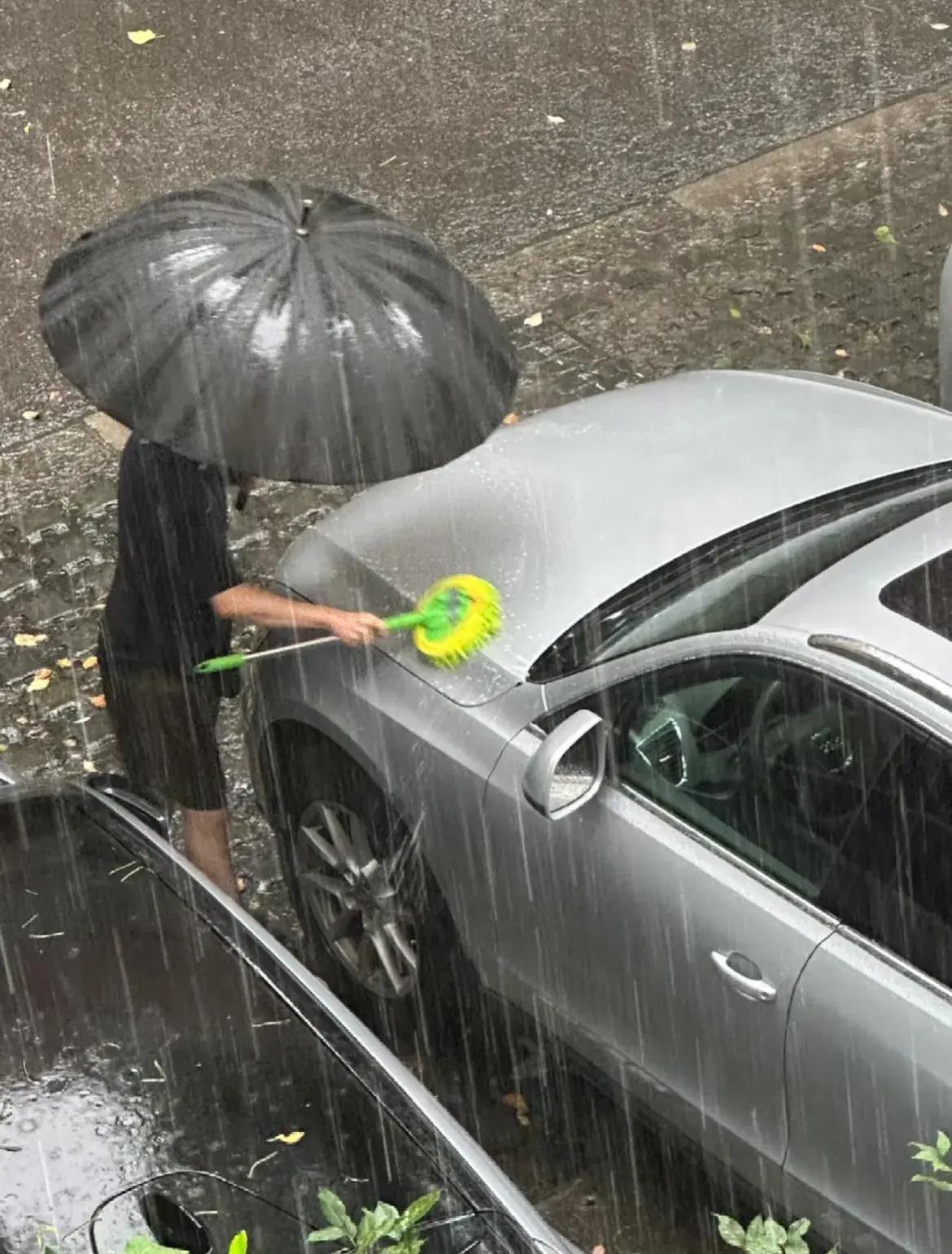 一般情況,我會跑兩趟,第一趟是下了一會兒雨,車完全被淋溼且能沖走一部分泥沙時,跑下去打沫沫,刷一遍;然後第二趟是雨停,去擦乾。