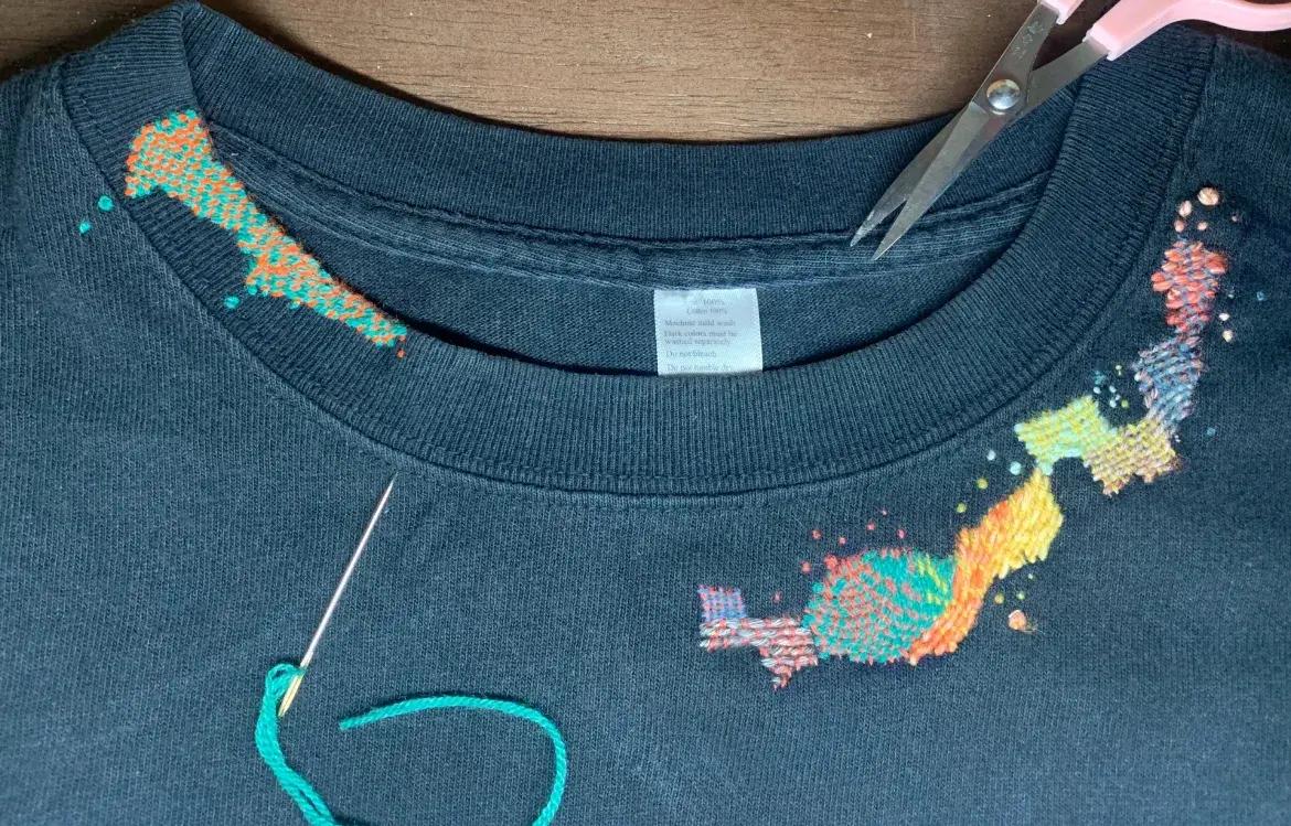 第二種是喜歡的衣服破了,比如衛衣領口,直接縫補的話會有痕跡,這時可以用綵線刺繡。