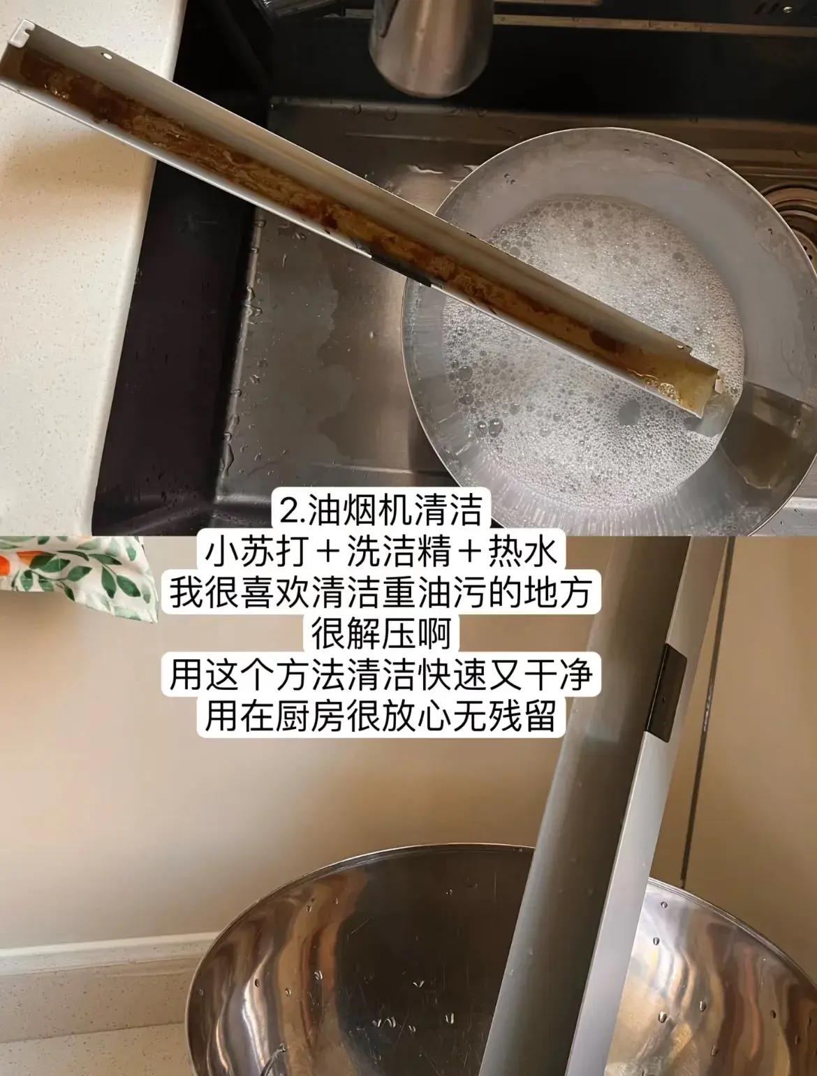 碰到油煙機、竈臺這種重油污,就用小蘇打+洗潔精+熱水,頑固油污也能快速分解,而且沒什麼異味、殘留,用着很安心;