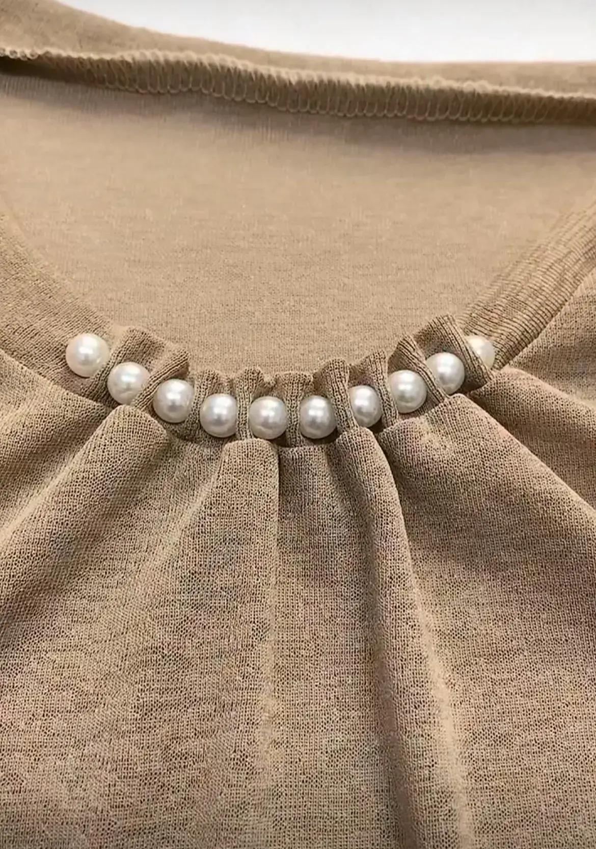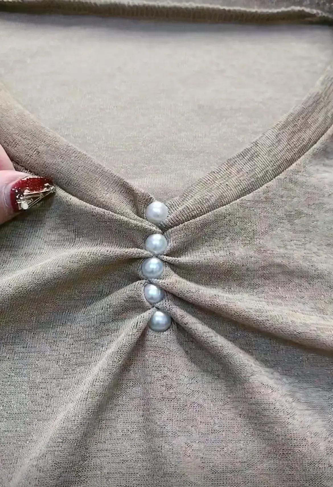 領口大分兩種,如果是圓領穿久了變大了,則可以用珍珠間隔縫幾顆,既收了領口,還增加了裝飾;