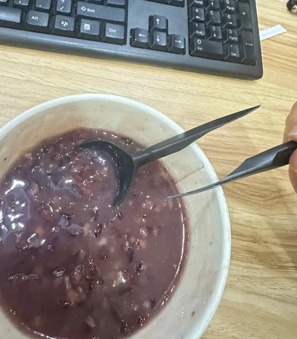 不信,你就再看看配套餐具,黑色勺子薄的挖米飯費勁、舀湯擰巴,跟患了肌無力一樣;