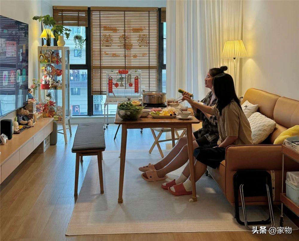 家裏若空間很小,在不放茶几後,可以將原本茶几空間騰出來放餐桌和四把餐椅,將客廳與餐廳功能相互融合,此時不僅更爲節省空間,也能給一家人提供個相對寬敞的喫飯區域。