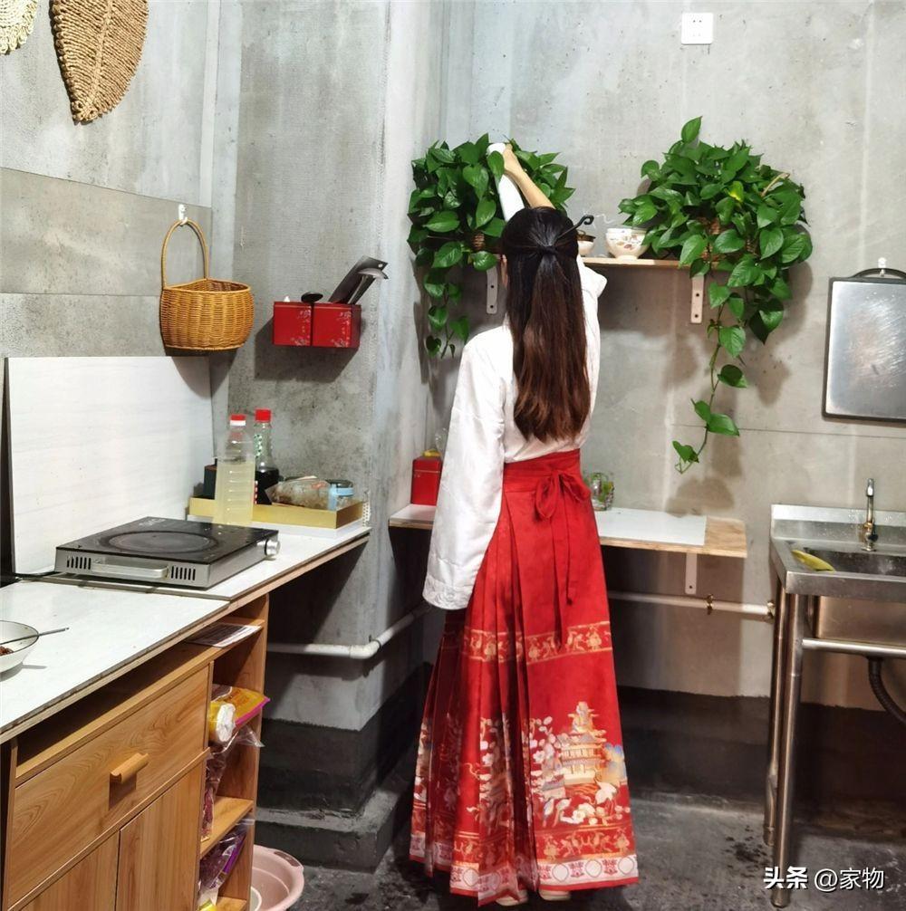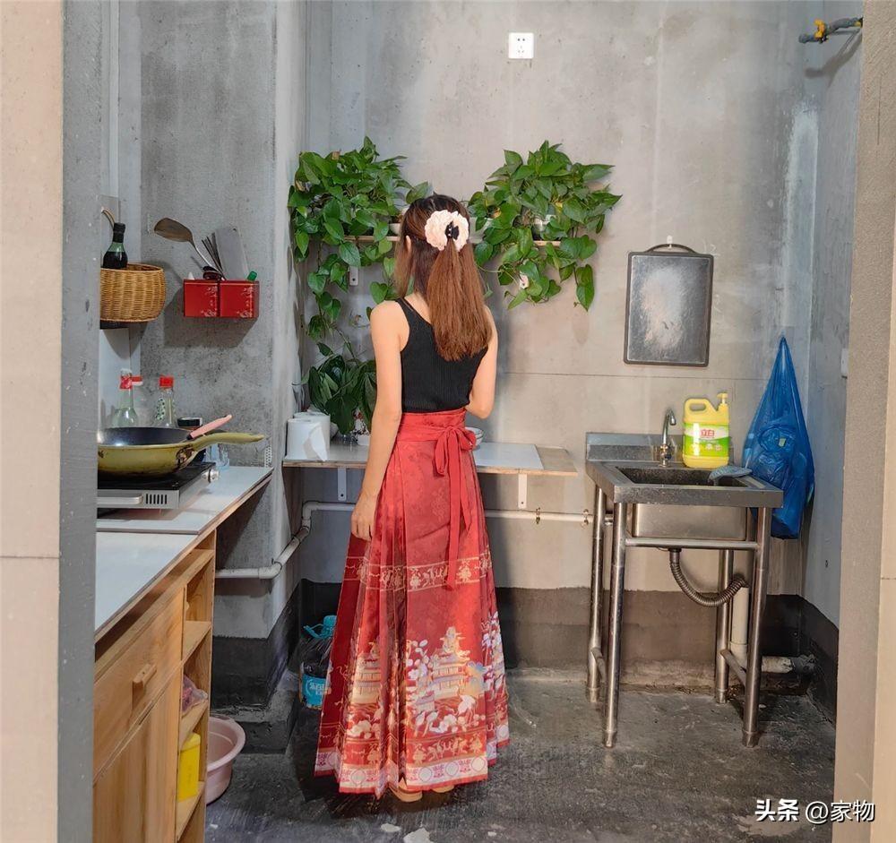 爲了降低毛坯房的冰冷,就連廚房也擺上了兩株綠蘿進行裝飾。