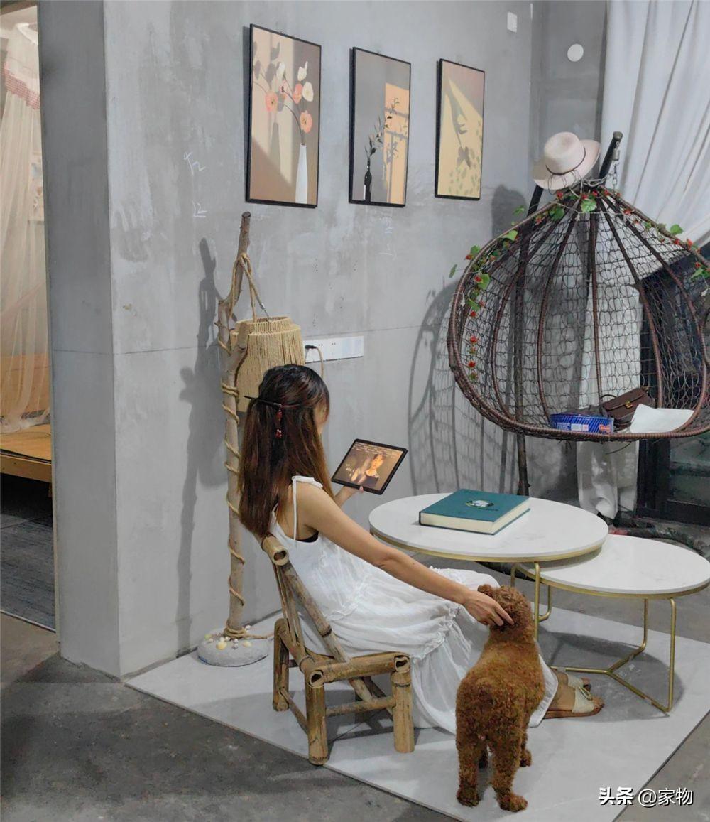 一個人住的客廳,真的要隨意很多,一把小椅子、一張小地毯,搭配吊籃椅和雙層茶几,就變成了她和狗狗最悠閒愜意的生活空間,坐在這裏追劇看書都很爽!