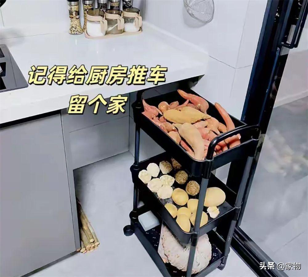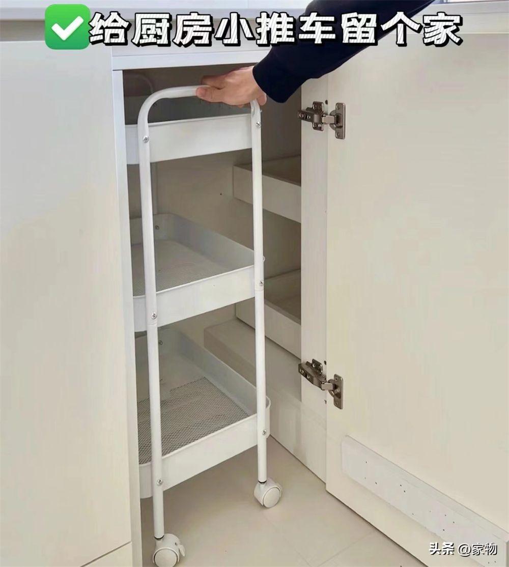 家裏的櫥櫃下面,也完全可以留出一個空格,用來收納菜籃和小推車等物,這地方很多人光想着做普通櫃格,而忽視了真正便利的無底櫃,或開放格的收納。