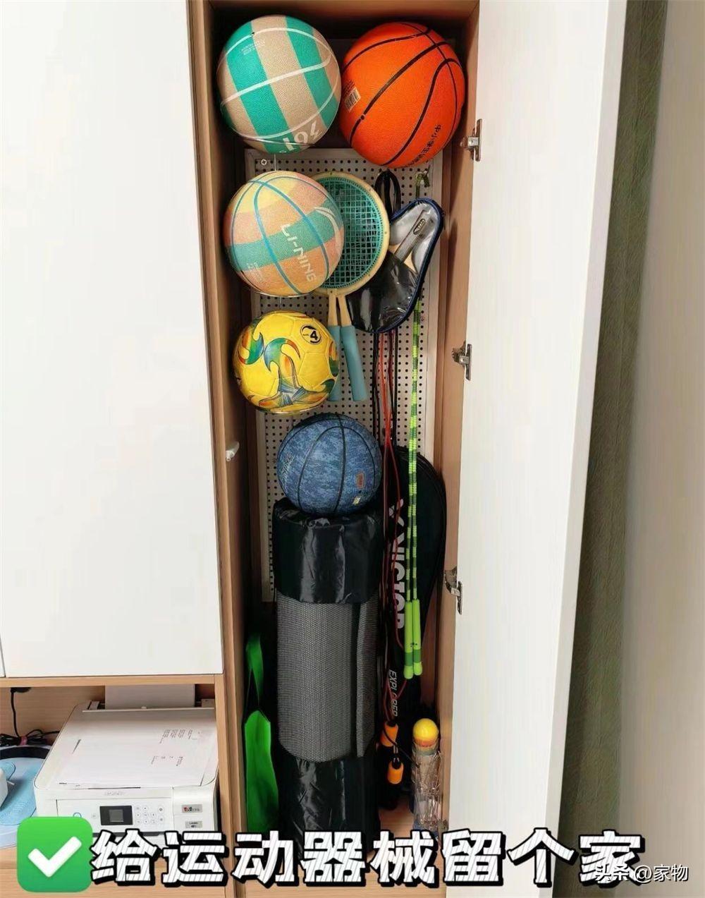 又比如喜歡各種運動的小夥伴,可以把各類運動器械塞入櫃子裏,給這些運動器材留個小空間,每次拿取收納就去這個櫃子裏,真的要比亂塞亂放有條理太多了。