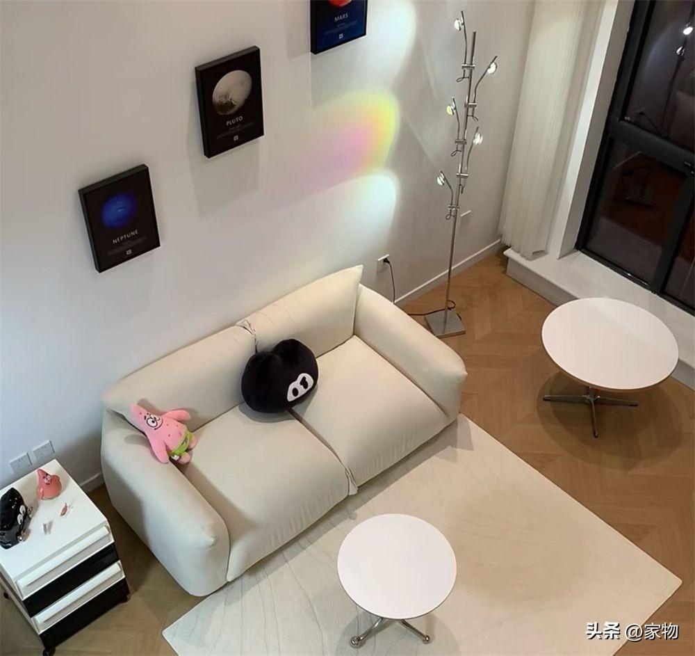 客廳沒有做電視牆,一張雙人位沙發靠牆擺放,面前放小圓桌和地毯,下班回家後,可以在這裏看看書,窩在沙發上放鬆放鬆,小家反而能給人更溫馨,更慵懶的感覺。