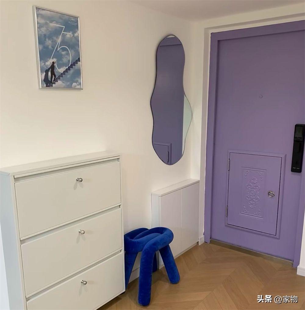 進門的玄關,因爲兩側空間較窄,只好貼牆做極窄鞋櫃和收納櫃,一把很有趣的椅子放在倆窄櫃中間,起到了點綴作用。