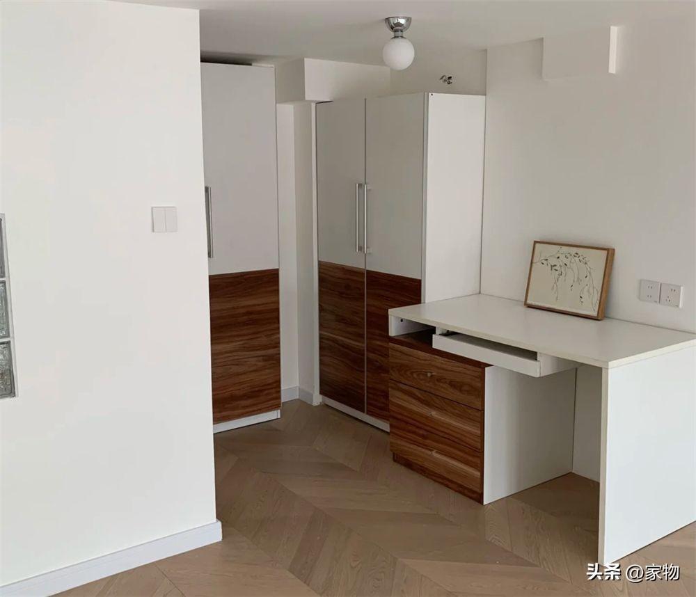 留出放雙人牀的位置後,靠裏的轉角做一組衣櫃和書桌,把角落小空間當成了步入式衣帽間,收納一個人的衣物和大件牀品紡品輕輕鬆鬆。