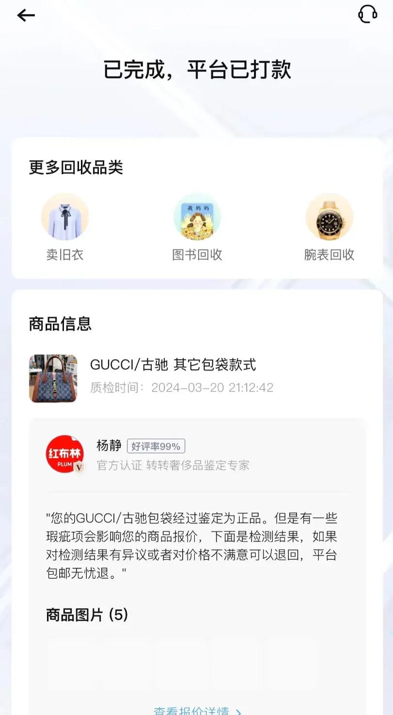 早些年我的一個GUCCI包包,買來很少用,搬家就想賣掉,別的平臺掛半年都沒賣出去,紅布林回收拍照上傳審覈、大概兩天時間就出手了。