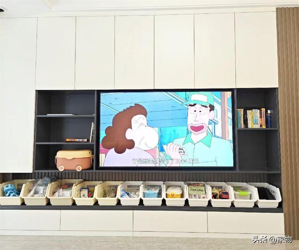 而如果開間有四五米,或者是橫廳,做滿牆電視櫃其實真的要比所謂的裝飾背景牆實用很多,好看又能收納。