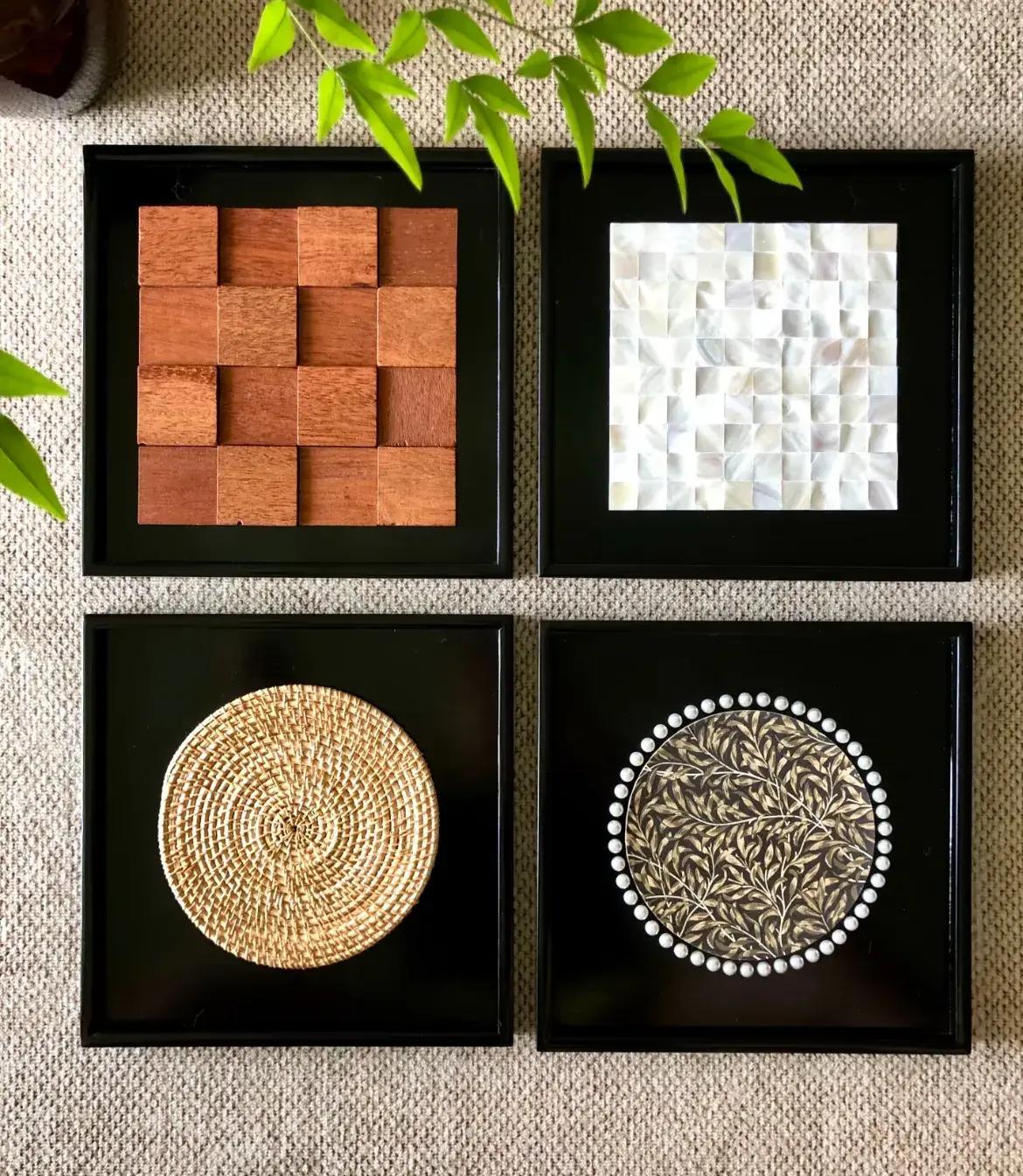 圓形藤編質感的掛畫,你沒看錯,就是用那種藤編的隔熱墊,直接貼上去的,以隔熱墊平整均勻的質感,都不用過多處理,直接粘就行。