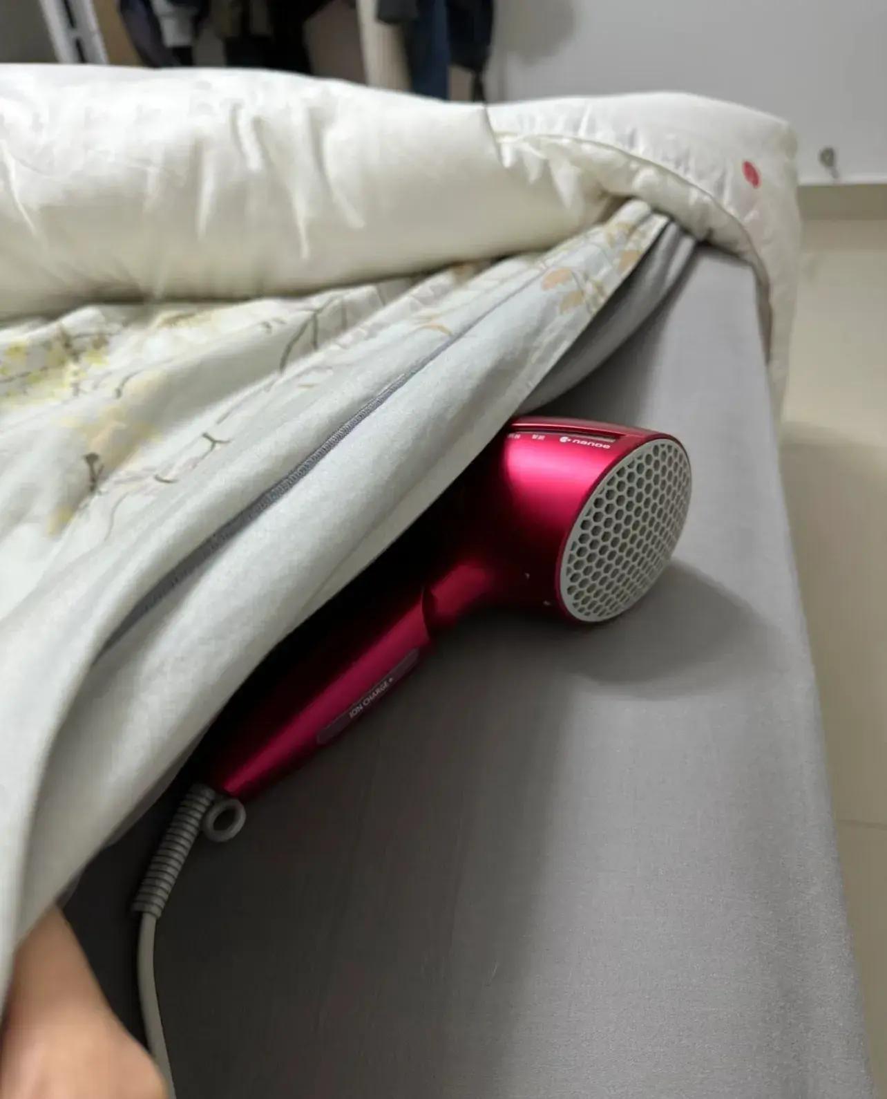 天氣太潮溼,被窩裏溼溼冷冷的,那不妨,讓吹風機當一回烘被神器,把被窩裏烘一下,就會舒服好多。