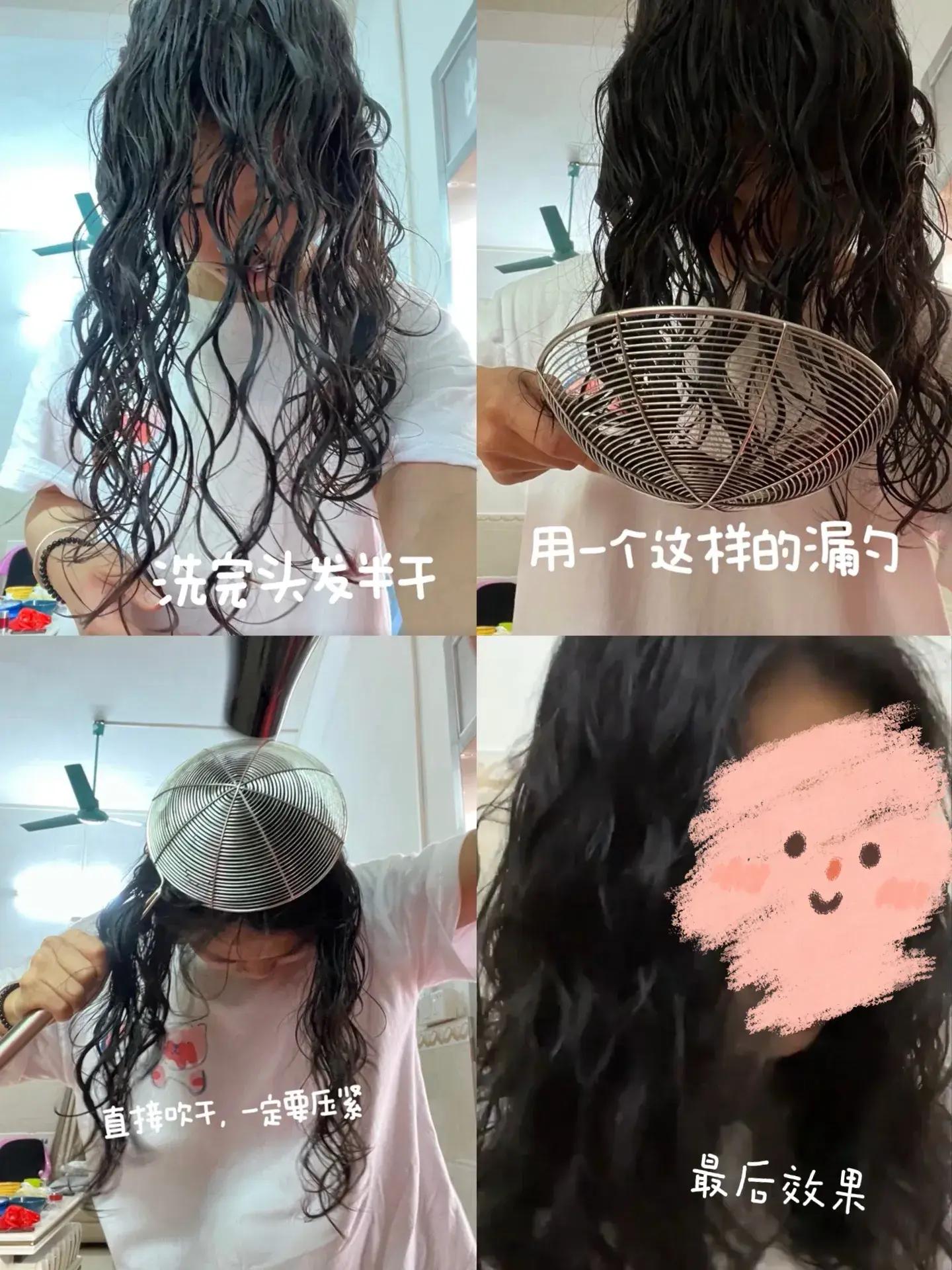 想要類似單單卷的全頭捲髮,那就找個笊籬,把頭髮放進去壓緊,然後用吹風機吹,待帶全頭的頭髮吹乾,你也就收穫一個免費的蛋蛋卷了。