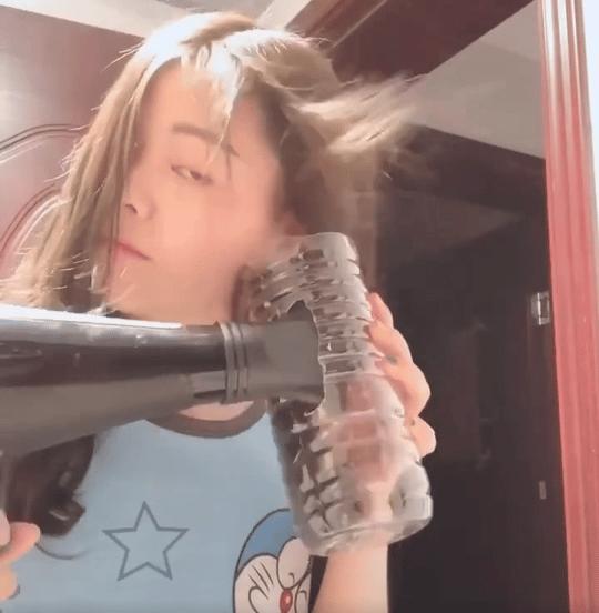 給礦泉水瓶開一個小口,夠吹風機把風吹進去就行,然後把頭髮往瓶子裏一放,用熱風吹個半分鐘,直髮就立馬變捲髮。
