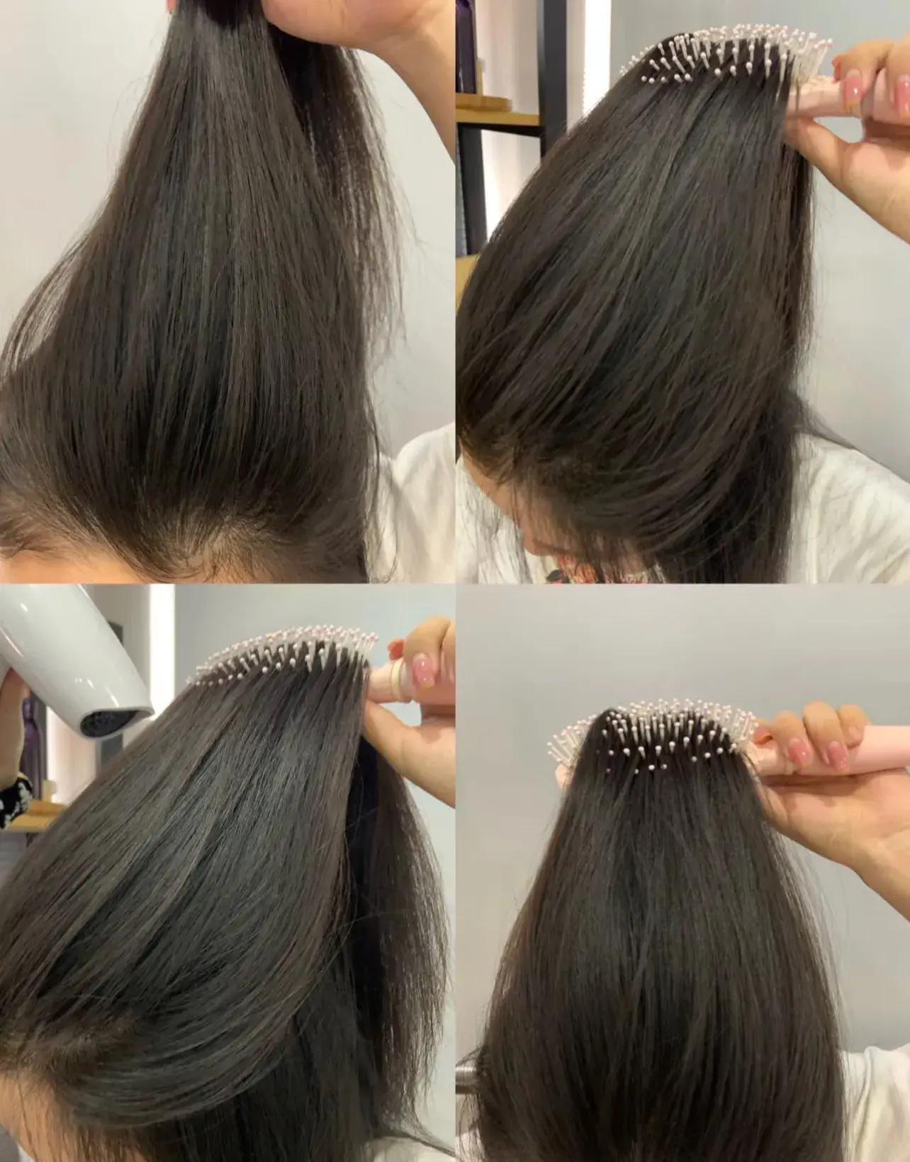 很容易,隨便用個梳子,把頭髮根部梳起來,然後稍微往前推一點,配合吹風機對着髮根吹個十秒鐘,那頭髮就原地起高樓了!