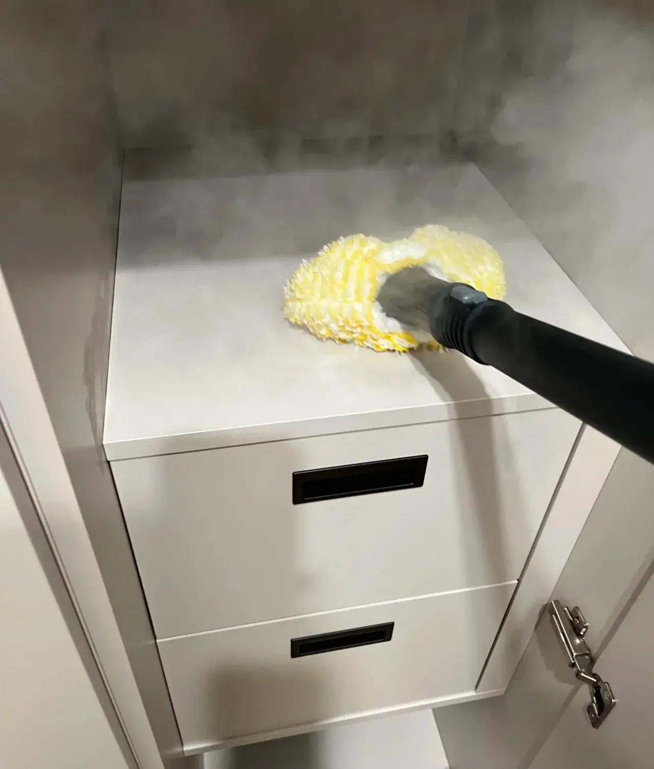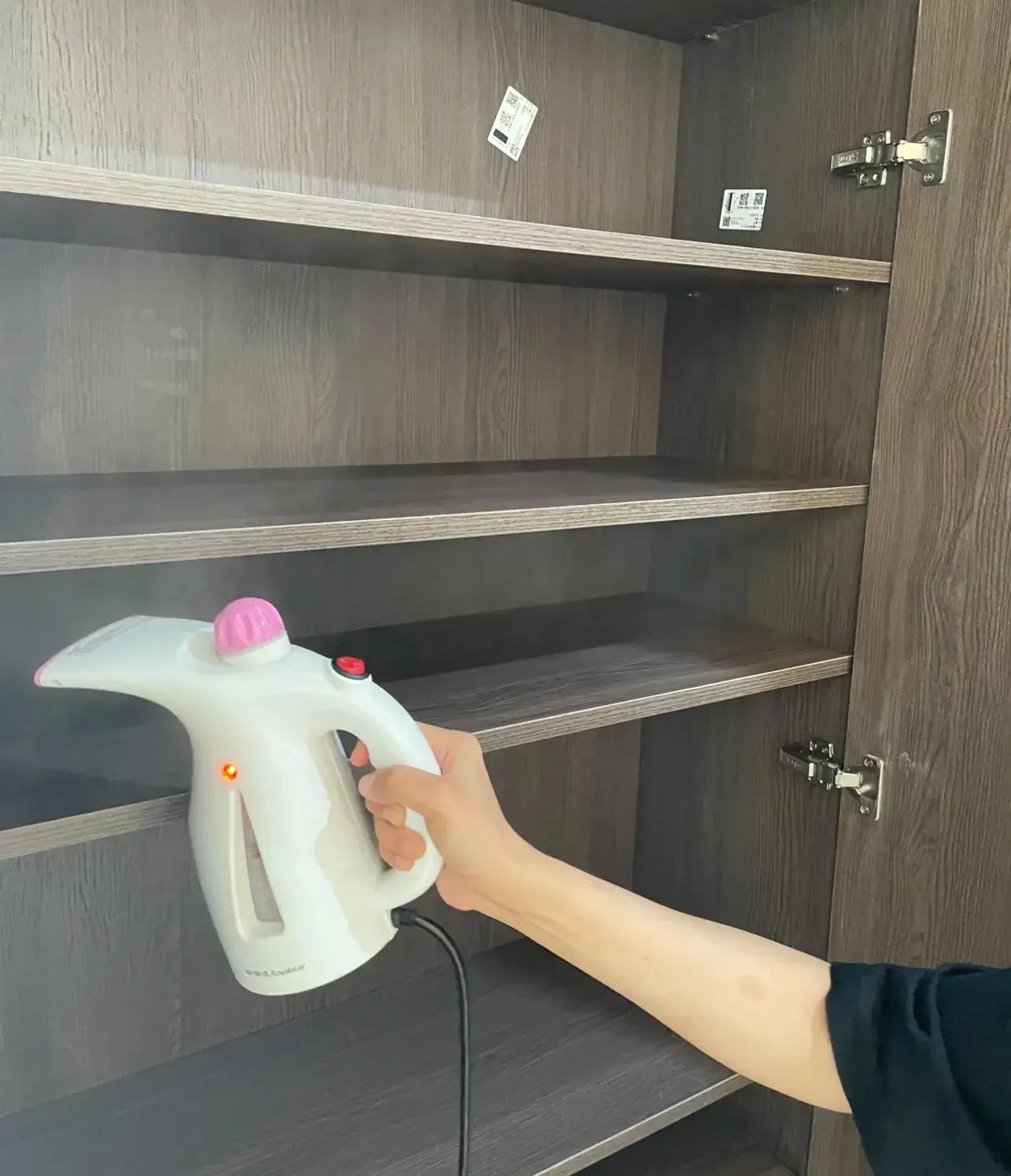 因爲知道甲醛可以溶於水,所以學着除醛公司的樣子,用掛燙機把櫃子燻了個遍。