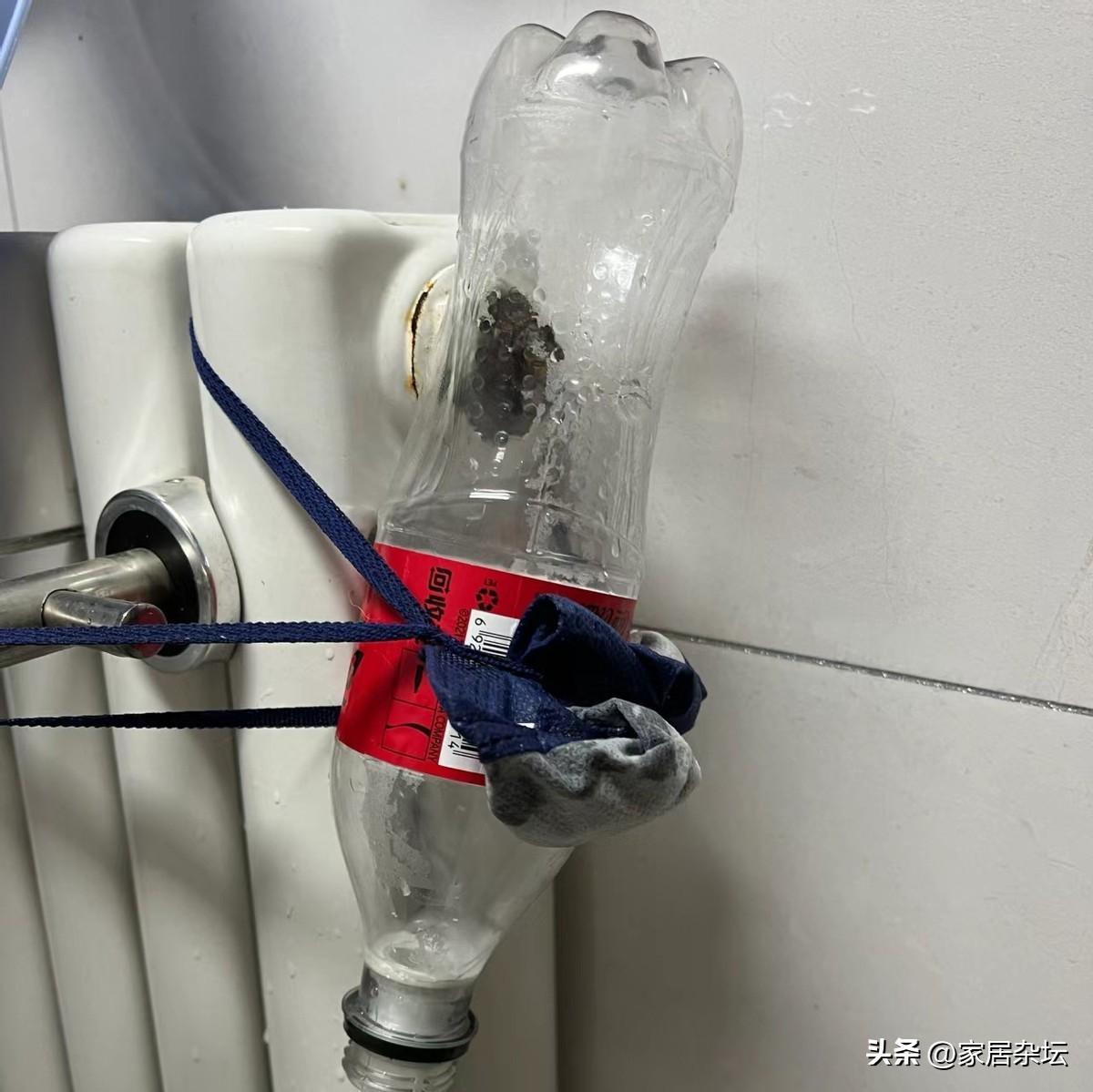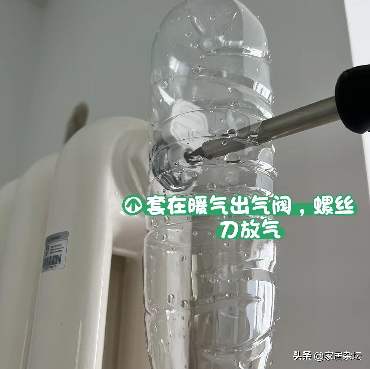 ①、暖氣片排氣。我們用個礦泉水瓶子,打個孔,然後套在排氣閥上。之後通過這個孔,把螺絲刀插進去,擰開排氣,就可以了。