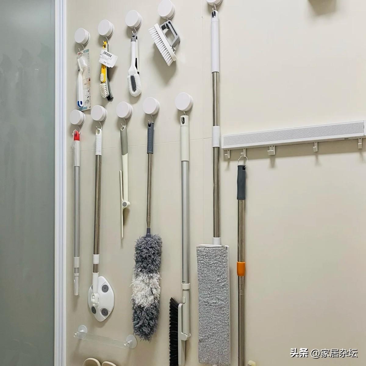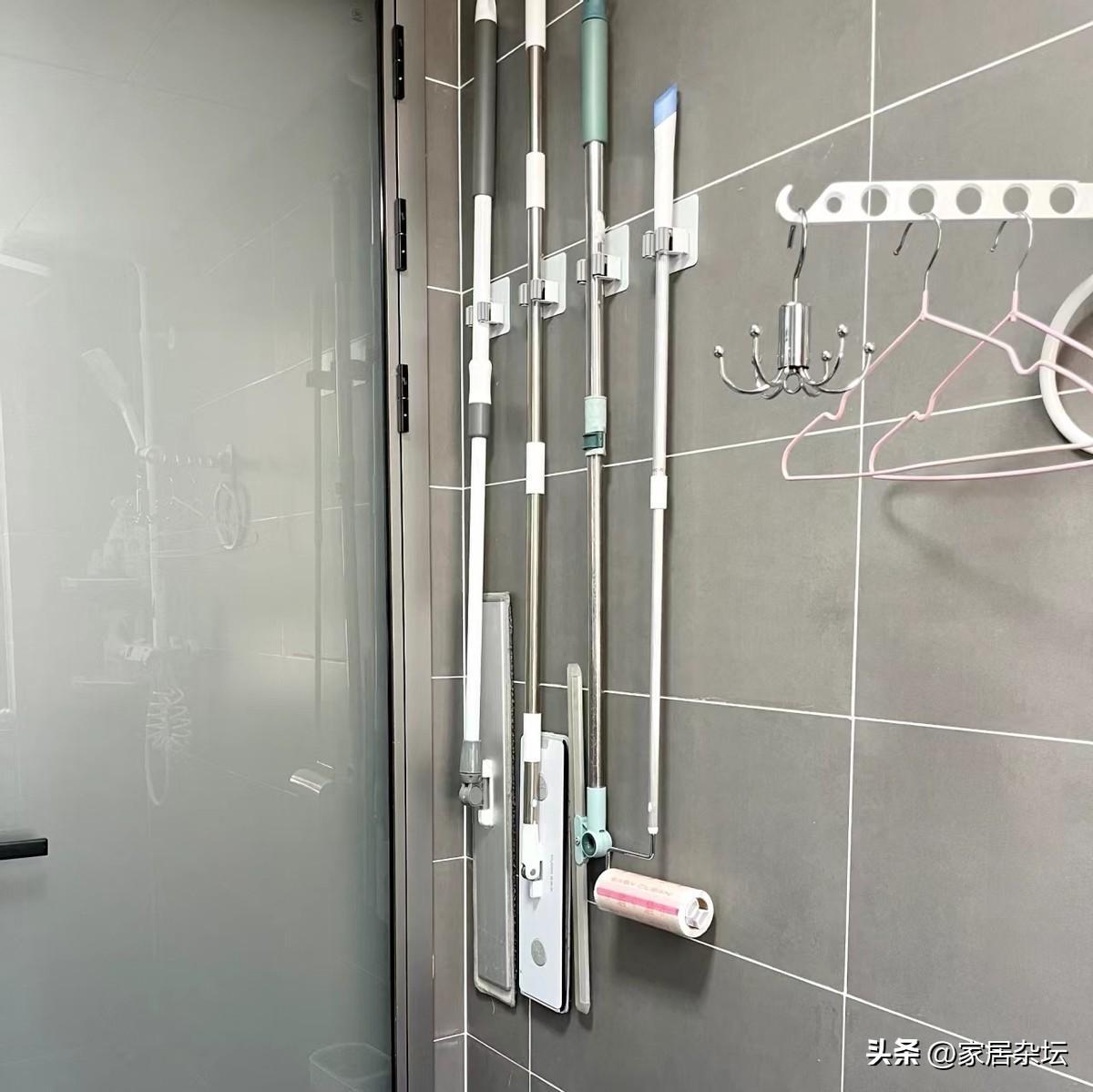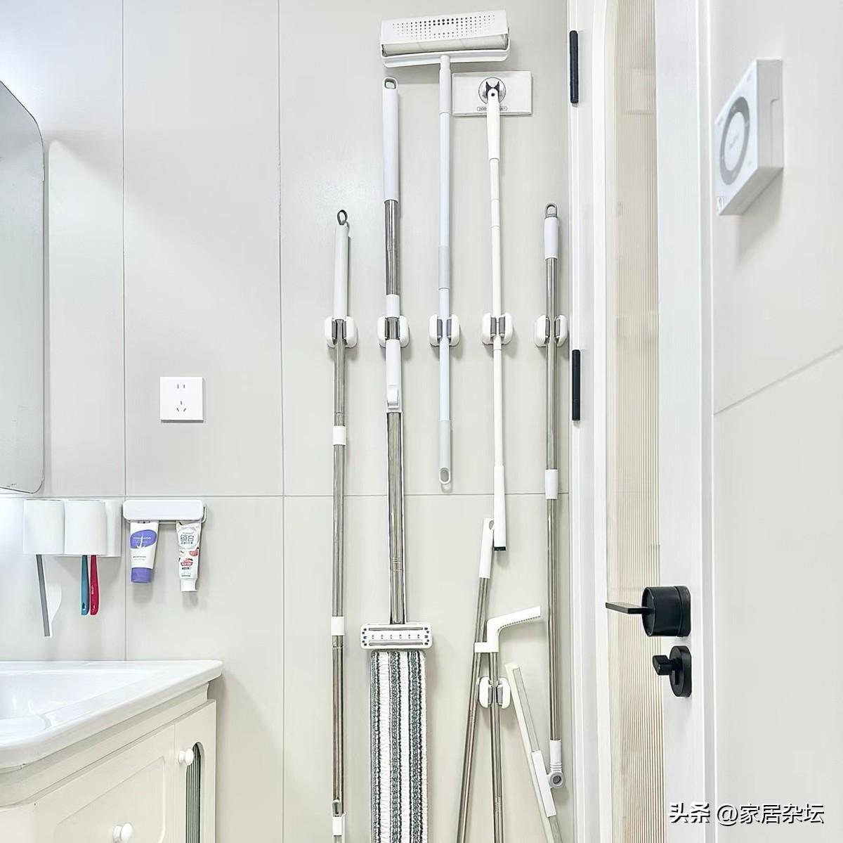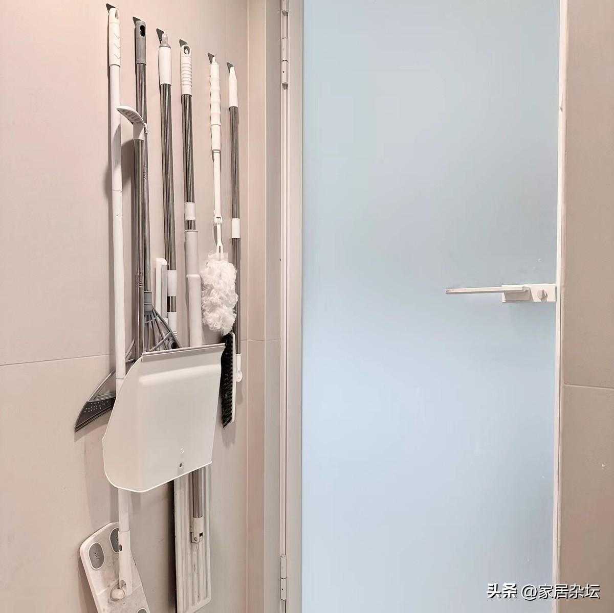 之後,你就會發現,衛生間幾乎所有的物品,都可以收納在門後頭。例如拖布往上面一掛,刷鞋的刷子往上面一掛,玻璃浴房的刮子同樣往上面一掛。可以說,衛生間所有的用品,就沒有掛不上去的。