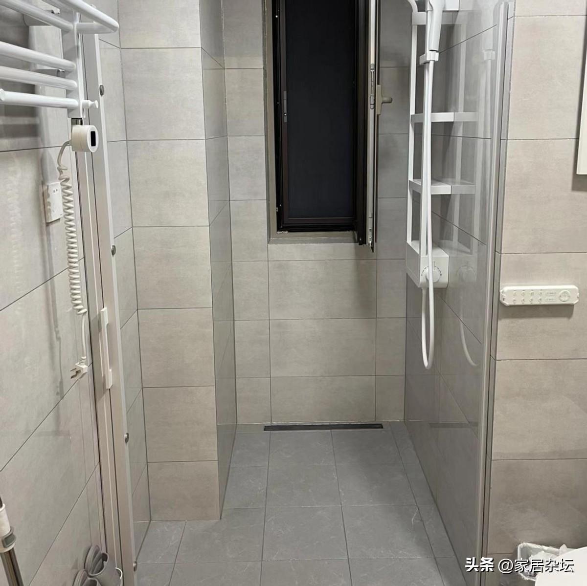 淋浴房的區域,是採用的下沉式的浴房。淋浴房的地面,比衛生間的地面低了大概兩公分,這兩公分的高低差,是做成了一個斜坡。