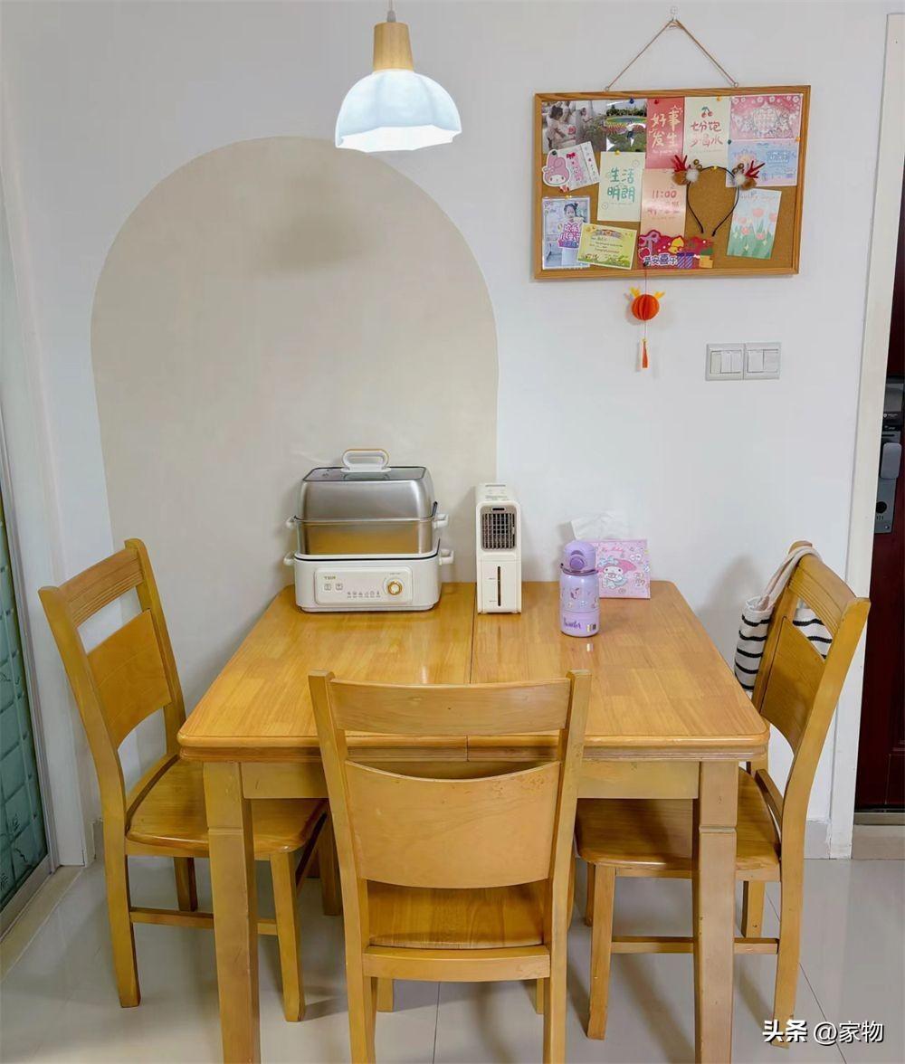 餐桌放在靠牆的位置,剛好擺放下這張小餐桌,平日裏三口人用餐坐得下,家裏有人來作客,搬出來展開餐桌桌面,擠一擠坐下六口人也完全沒問題。