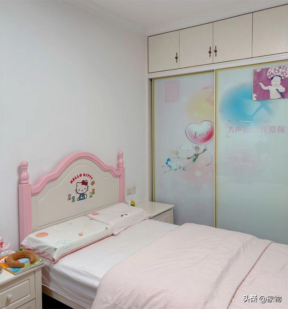 當時做櫃子,審美就是要那種帶圖案的,包括牀頭的HelloKitty也是,隨着孩子一天天長大,顯得過於童真了。