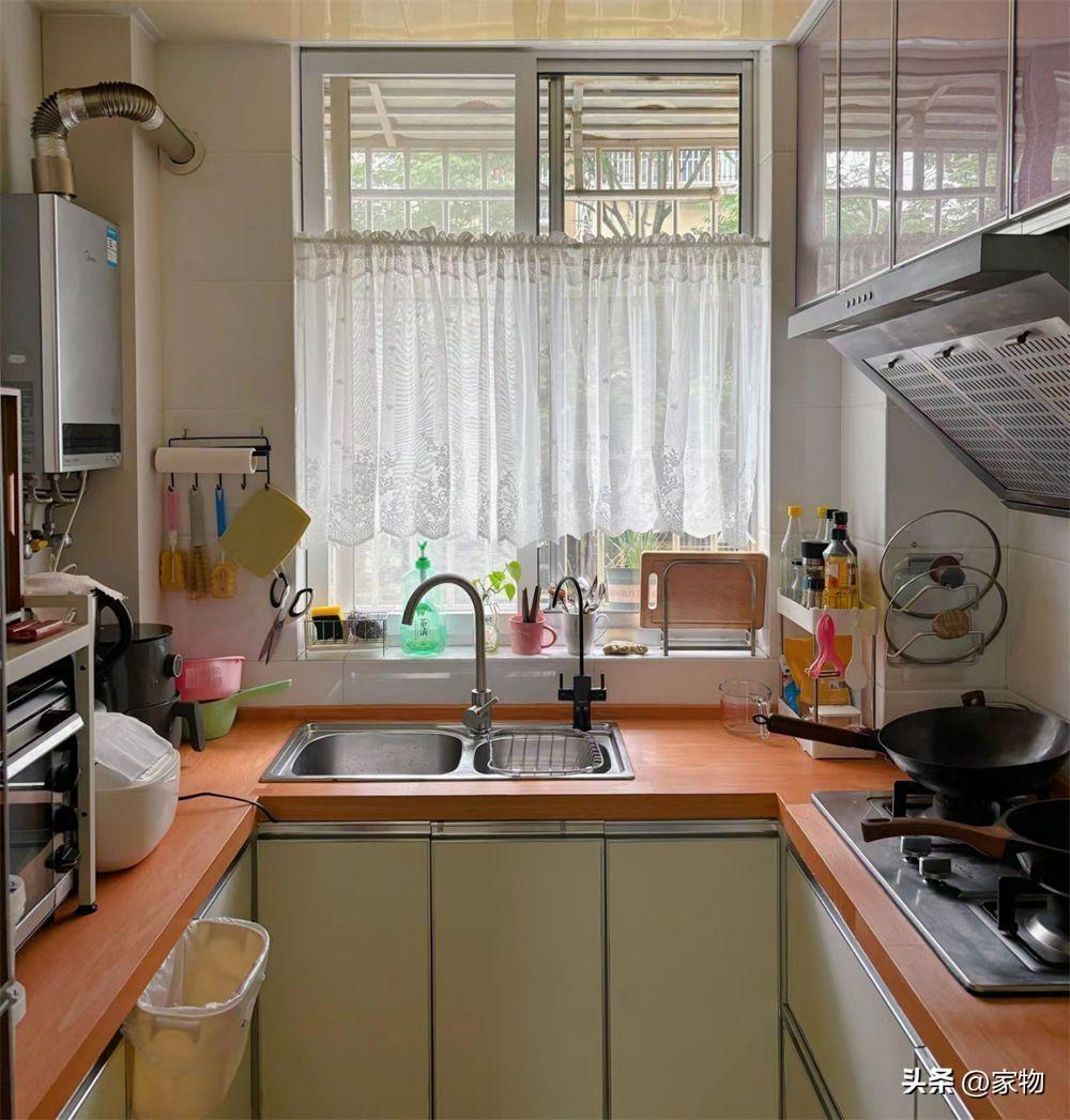 家裏的廚房做成U形格局,面對窗戶,左手邊放各類小家電,中間水槽是當年的小雙槽,除了洗鍋和湯盆有些不便,別的都還好。