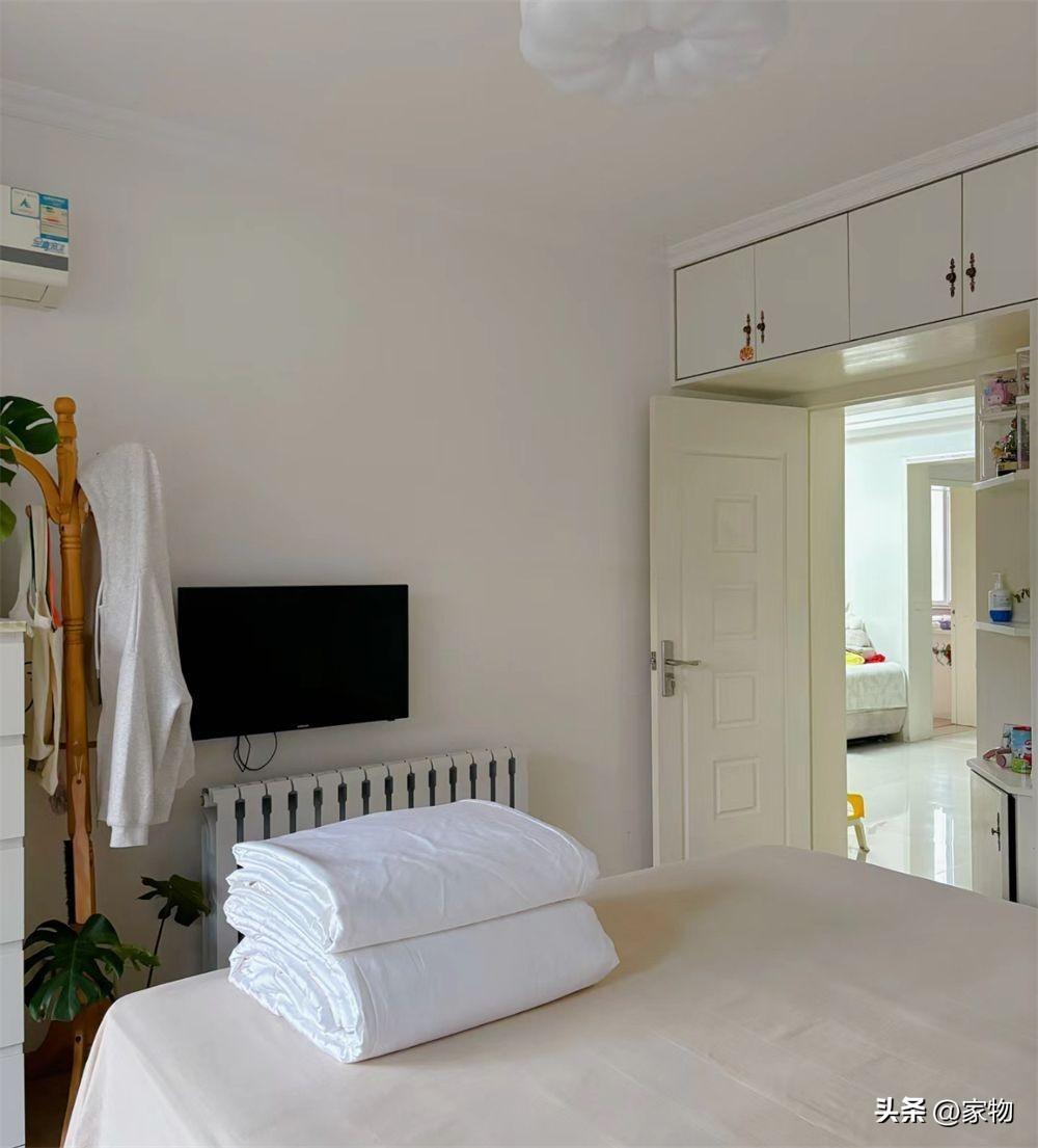牀尾掛一臺小電視,旁邊也放了櫃子和掛衣架,甚至連門上面的空間也做了吊櫃,老老舊舊的裝修,看起來說不上多精緻,但卻是一個家最有煙火氣、最有生活氣息的樣子。