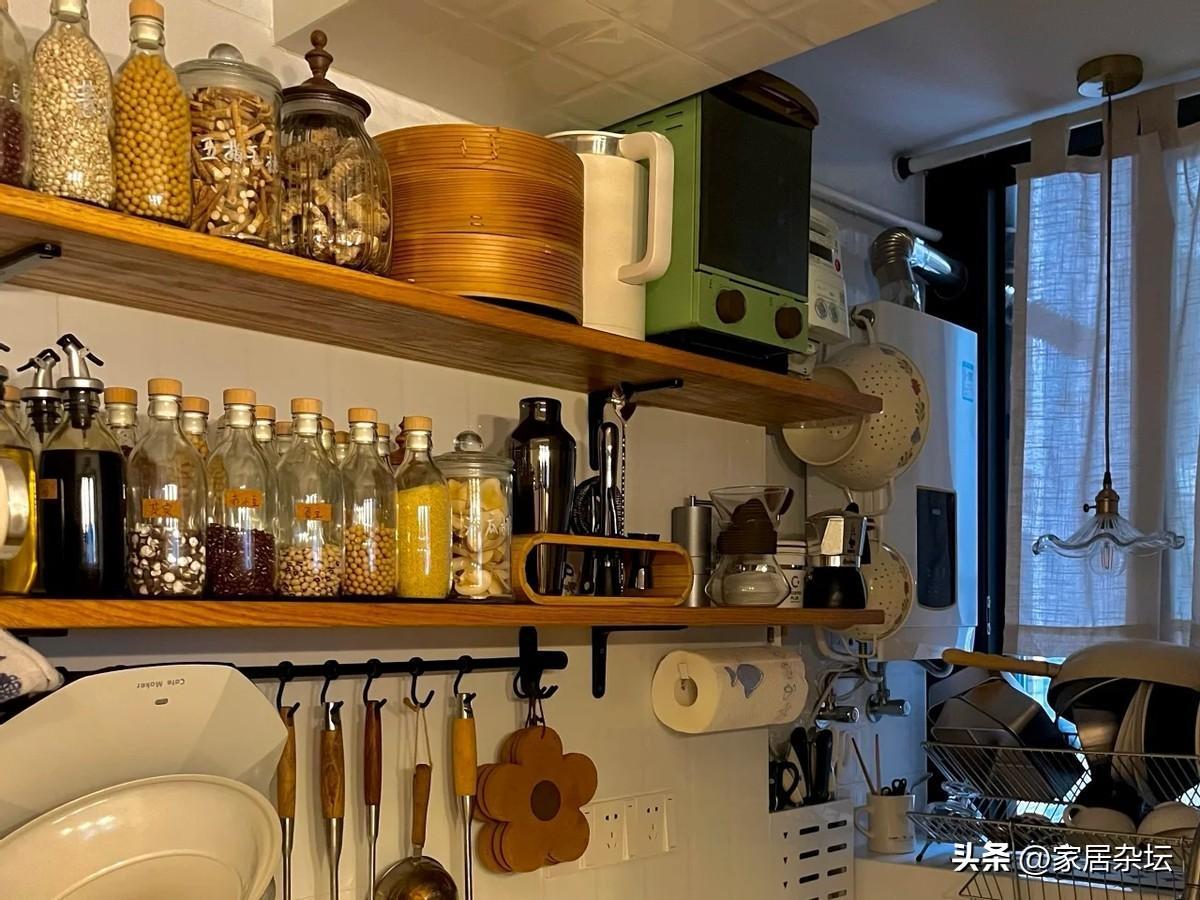 最終就是在廚房的牆面,安裝了一層一層的層板。層板用來放廚房的各種物品,例如油鹽醬醋,花椒大料等各種調料,瓶瓶罐罐。