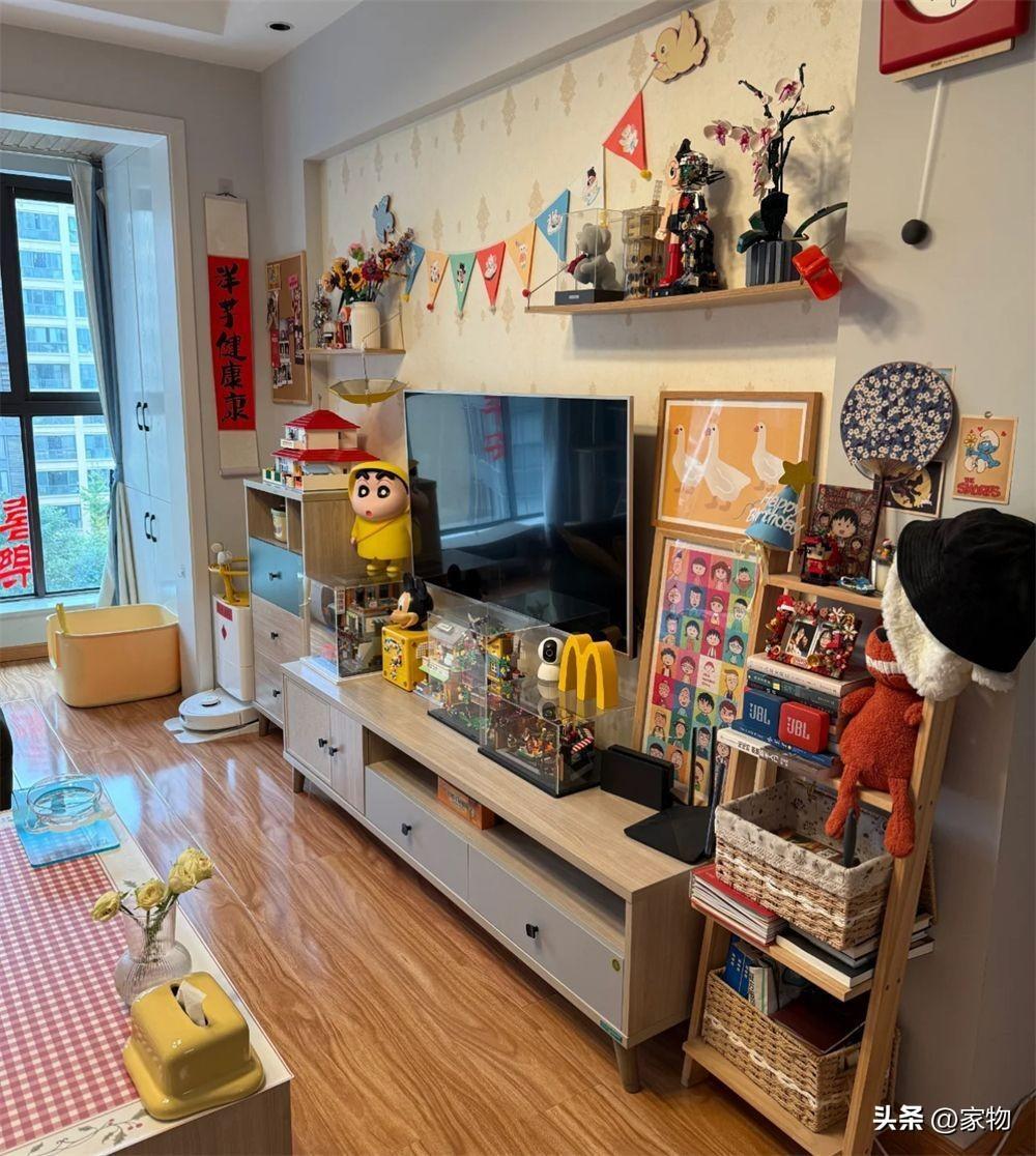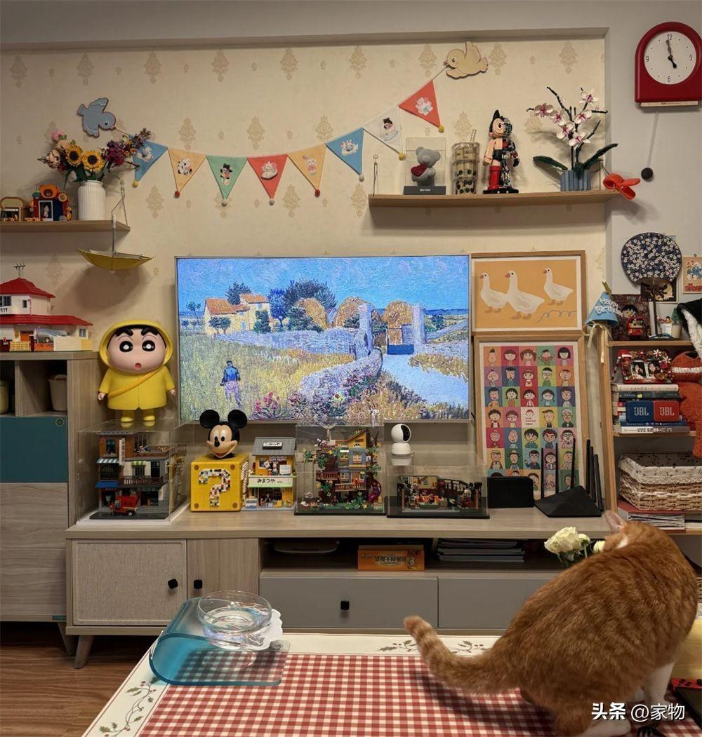 尤其是家裏的電視牆,在未經翻修的老舊牆面周圍,放置了各種各樣的模型擺件,還有色彩繁多的各種小物件,讓這面電視牆看起來格外有活力。