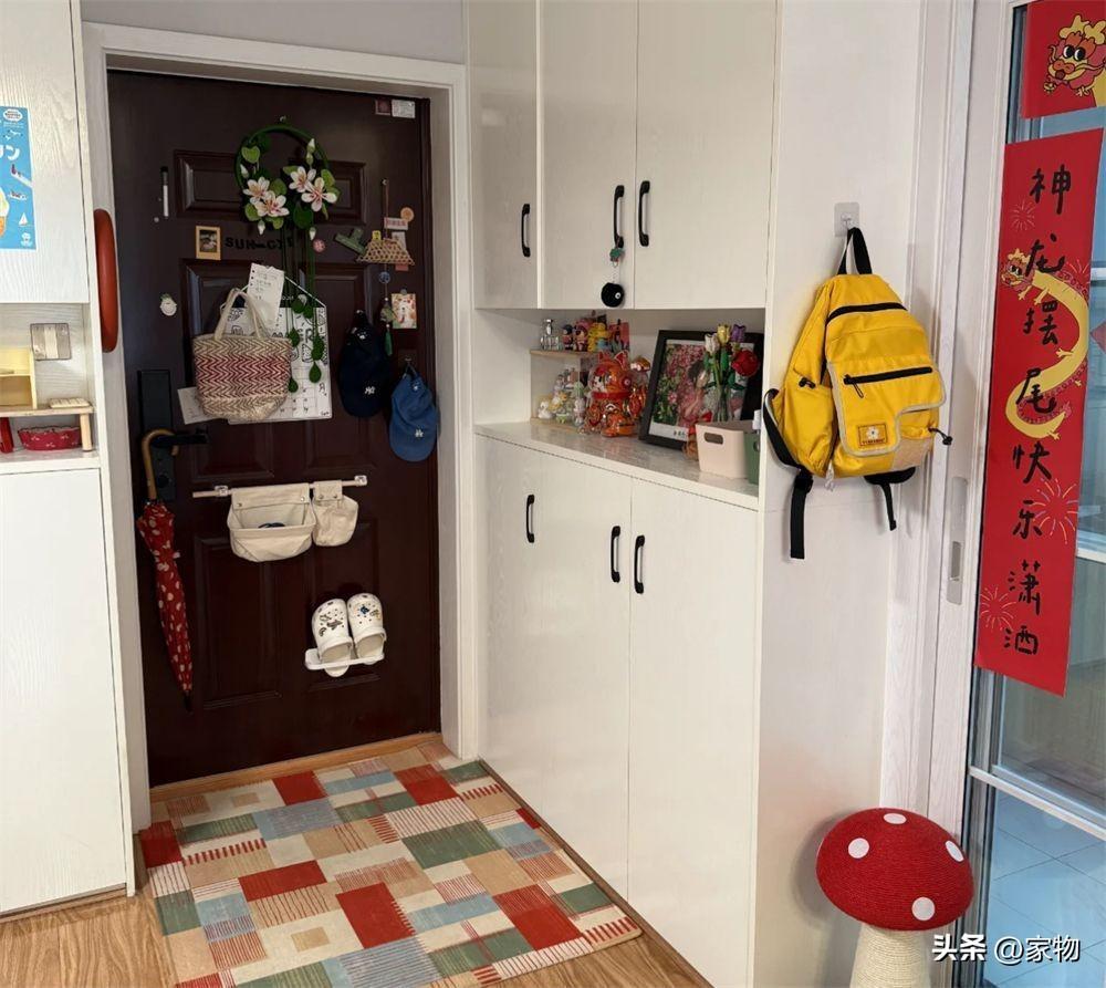 玄關櫃放在了側邊,實際上和餐邊櫃相互融合,底櫃隱藏收納鞋子,而常穿的室內鞋則直接脫在玄關地毯上。