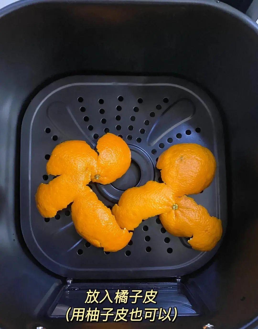 洗洗潔精清洗炸藍,擦乾水分,200°C烤10分鐘,放入橘子皮或者柚子皮,180°C烤10分鐘,中途翻面。